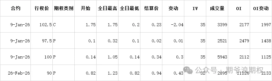 (3)美团:1月最大持仓范围100-137.5,窝轮牛熊街货分布90-115,今收101.0,下跌03.35%。期权盘路交易变化超过1000张的仓位如下,市场对美团还是窄幅震荡。富婆还是那个观点,美团的基本面没有发生改变前,股票大涨的可能性不大,不跌就不错了,短期内大概率会100上下窄幅震荡。