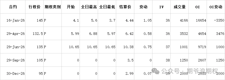 (2)阿里:1月最大持仓范围150-160,窝轮牛熊街货分布135-165,今收142.6,下跌2.26%。期权盘路变化超过1000张的仓位如下,虽然好几个月份的,但都是认沽,而且增仓行权价都是135以下,你品,你细品。马爸爸还是那个马爸爸,买了阿里股票,拿个五年十年,大概率还是涨的。