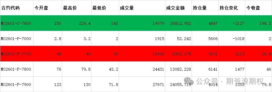 (4)中证1000期权:1月最大持仓范围7700-8000,今收7971.59,上涨0.82%。期权1月主力合约,认购和认沽都是低行权价减仓高行权价增仓。认购减仓集中在7300-7800,合计4000张,增仓集中在7900-8300,合计1000张;认沽减仓集中在6600-7200,合计2300张,增仓集中在7400-8200,合计6800张。变化超过1000张的仓位如下,红色是增仓较大的,绿色是减仓较大的。