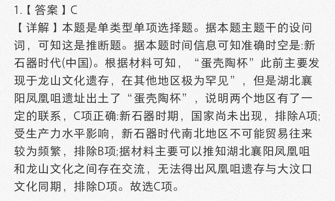 【详解】本题是单类型单项选择题。据本题主题干的设问词,可知这是推断题。据本题时间信息可知准确时空是:新石器时代(中国)。根据材料可知,“蛋壳陶杯”此前主要发现于龙山文化遗存,在其他地区极为罕见”,但是湖北襄阳凤凰咀遗址出土了“蛋壳陶杯”,说明两个地区有了一定的联系,C项正确:新石器时期,国家尚未出现,排除A项;受生产力水平影响,新石器时代南北地区不可能贸易往来较为频繁,排除B项;据材料主要可以推知湖北襄阳凤凰咀和龙山文化之间存在交流,无法得出风凰咀遗存与大汶口文化同期,排除D项。故选C项。