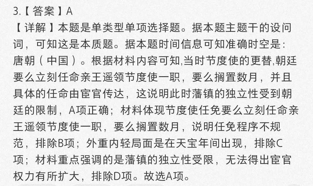 【详解】本题是单类型单项选择题。据本题主题干的设问词,可知这是本质题。据本题时间信息可知准确时空是:唐朝(中国)。根据材料内容可知,当时节度使的更替,朝廷要么立刻任命亲王遥领节度使一职,要么搁置数月,并且具体的任命由宦官传达,这说明此时藩镇的独立性受到朝廷的限制,A项正确;材料体现节度使任免要么立刻任命亲王遥领节度使一职,要么搁置数月,说明任免程序不规范,排除B项;外重内轻局面是在天宝年间出现,排除C项;材料重点强调的是藩镇的独立性受限,无法得出宦官权力有所扩大,排除D项。故选A项。