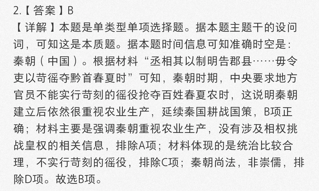 【详解】本题是单类型单项选择题。据本题主题干的设问词,可知这是本质题。据本题时间信息可知准确时空是:秦朝(中国)。根据材料“丞相其以制明告郡县……毋令吏以苛徭夺黔首春夏时”可知,秦朝时期,中央要求地方官员不能实行苛刻的徭役抢夺百姓春夏农时,这说明秦朝建立后依然很重视农业生产,延续秦国耕战国策,B项正确;材料主要是强调秦朝重视农业生产,没有涉及相权挑战皇权的相关信息,排除A项;材料体现的是统治比较合理,不实行苛刻的徭役,排除C项;秦朝尚法,非崇儒,排除D项。故选B项。