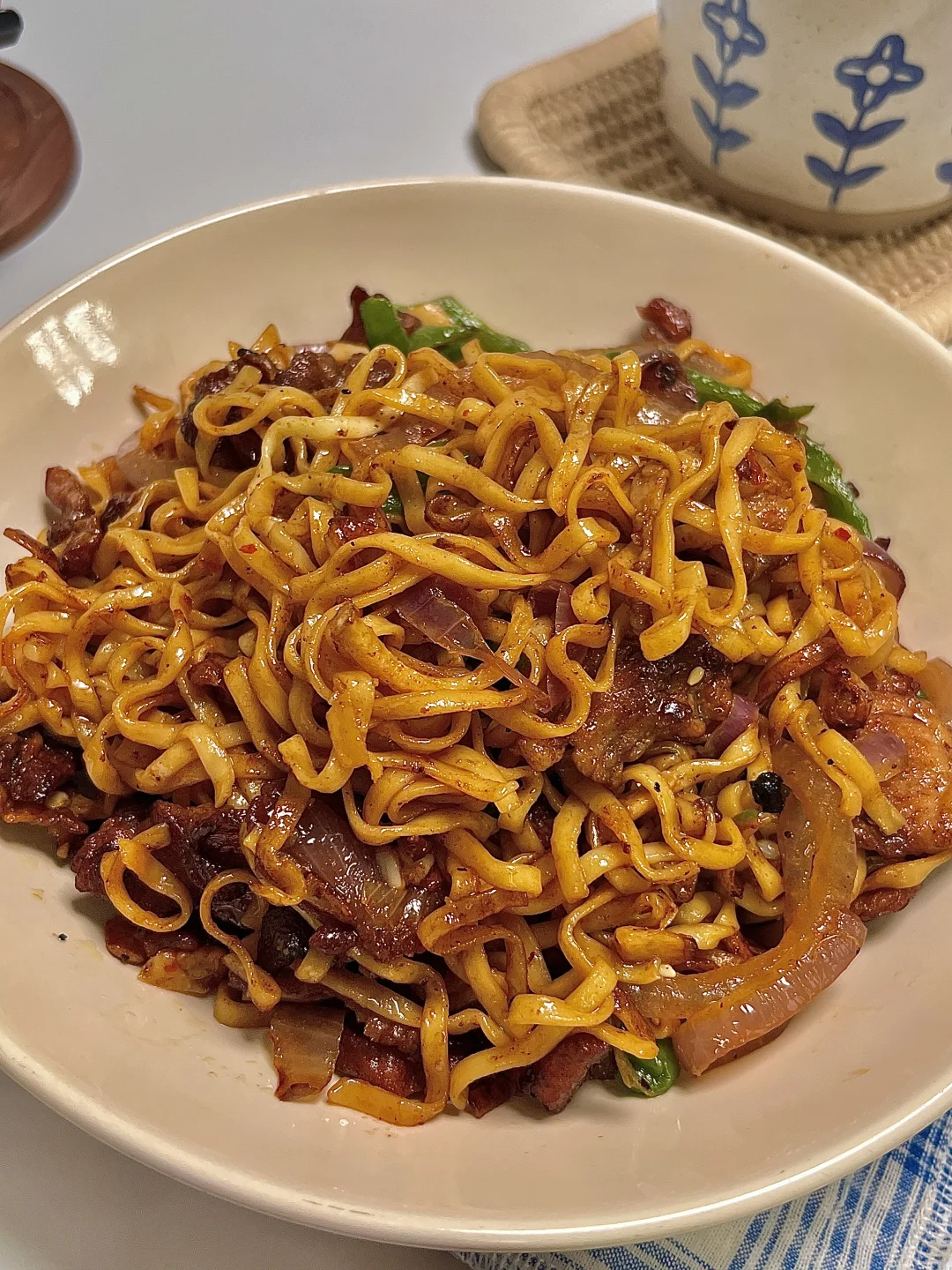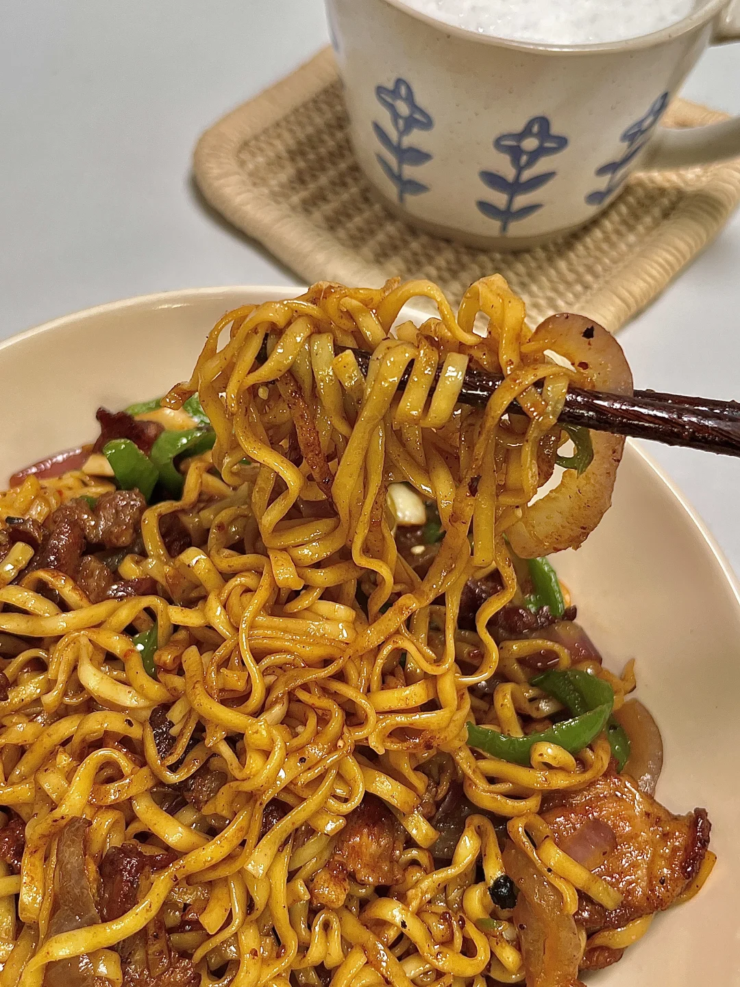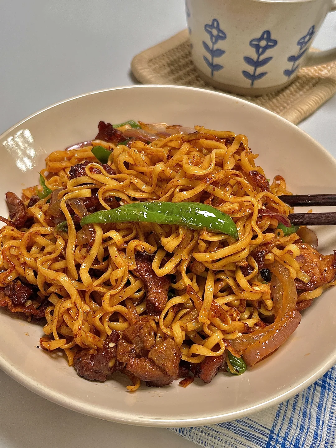 🍴今日份一人食: 小炒方便面 牛奶🥛 . 这是超好吃的辣炒方便面,嘎嘎香,锅气满满,秒杀路边摊啦~你就吃吧 又香又辣 巨好吃😋 爱吃的宝一定要去试试呀✌🏻