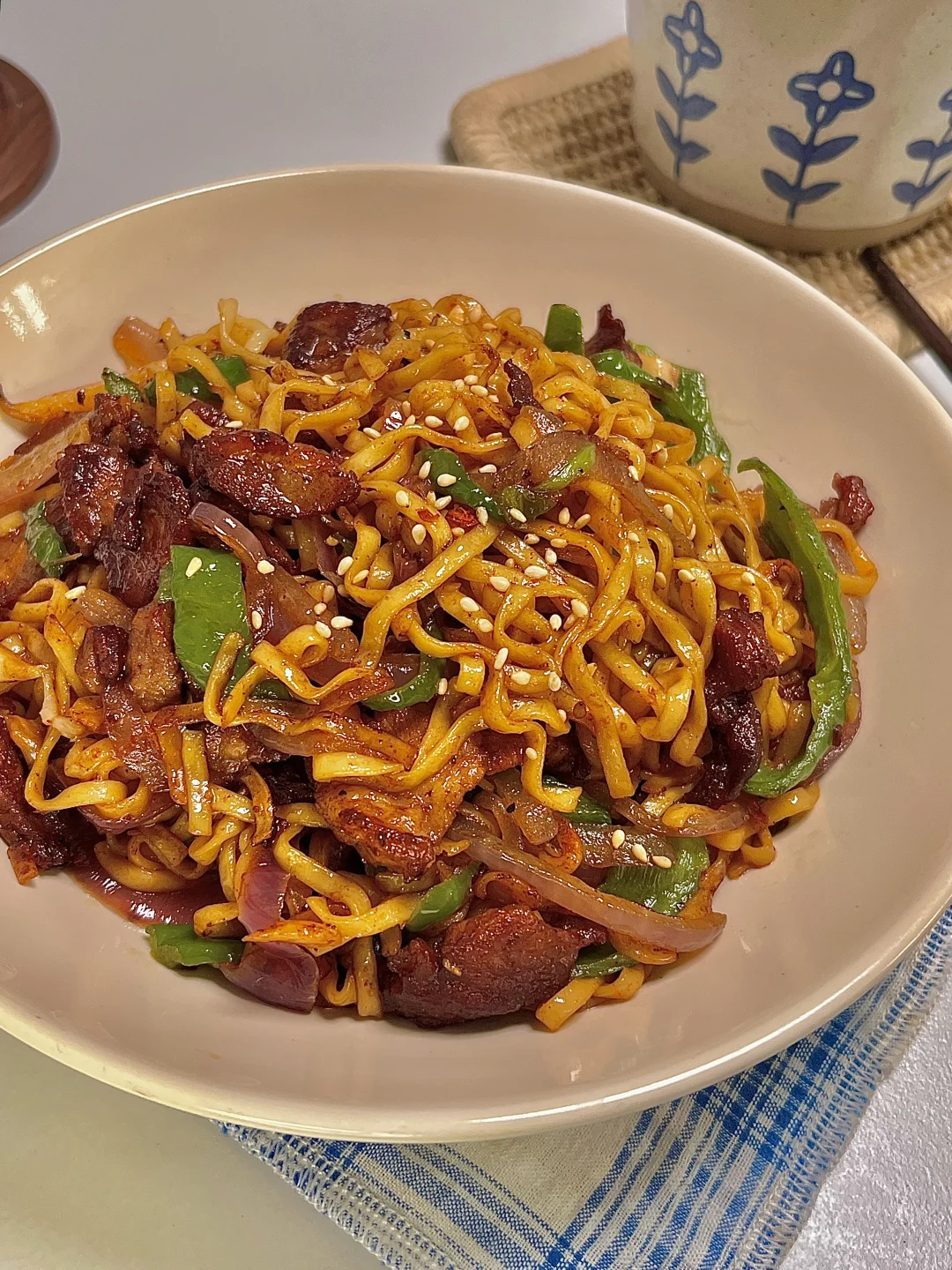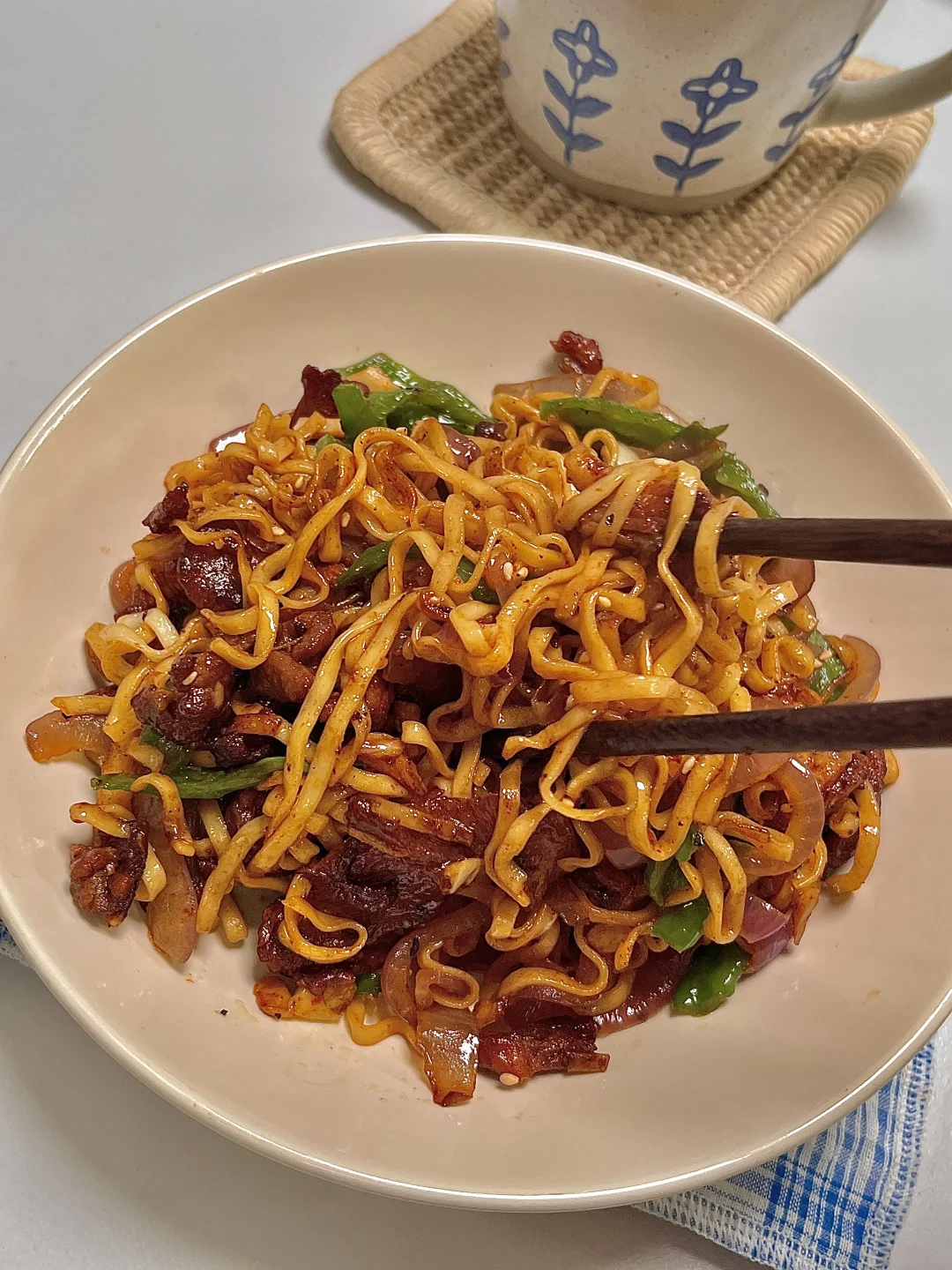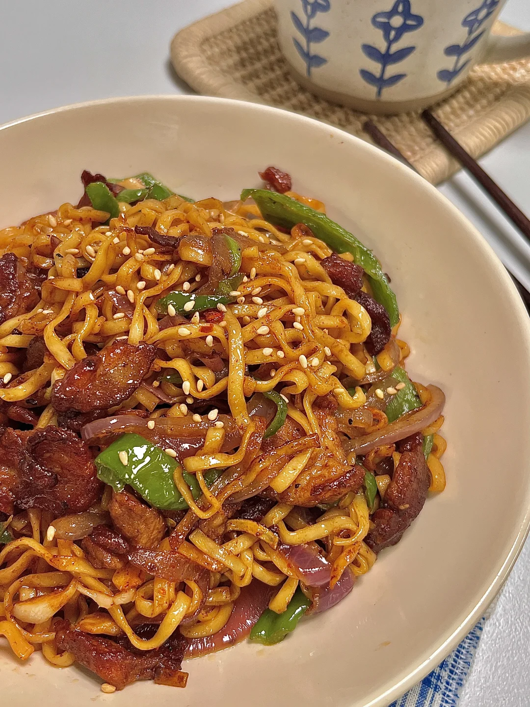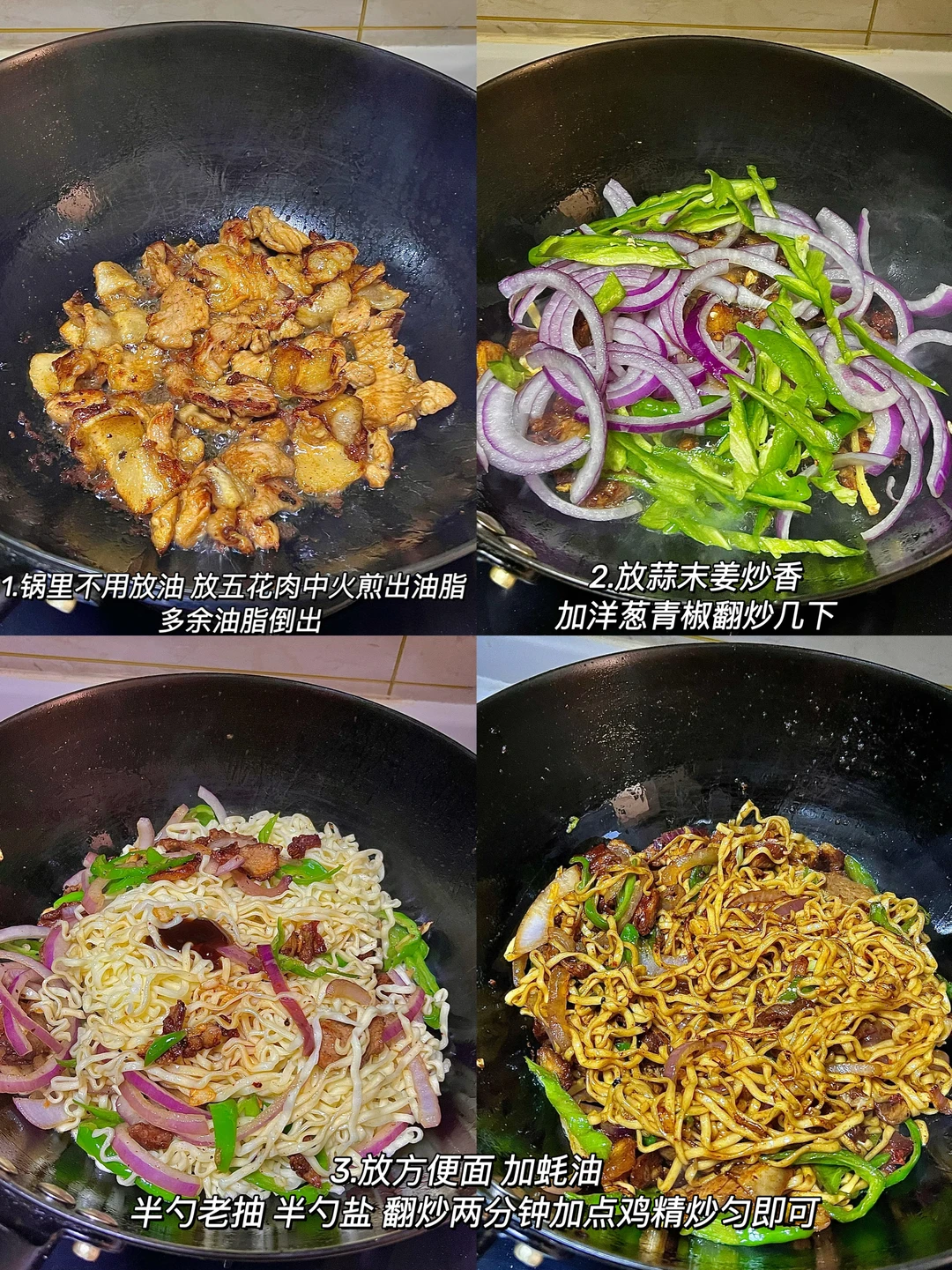 🍴今日份一人食: 小炒方便面 牛奶🥛 . 这是超好吃的辣炒方便面,嘎嘎香,锅气满满,秒杀路边摊啦~你就吃吧 又香又辣 巨好吃😋 爱吃的宝一定要去试试呀✌🏻
