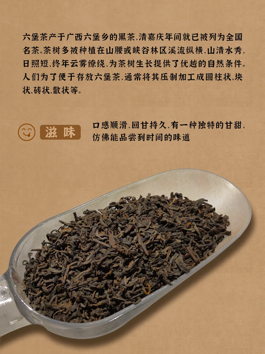广西梧州特产的黑茶,属后发酵茶,因原产六堡镇得名。陈香浓郁,自带槟榔香,茶汤红浓透亮,被誉为“可以喝的老古董”。