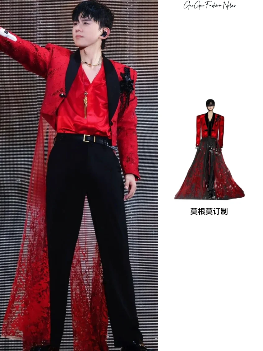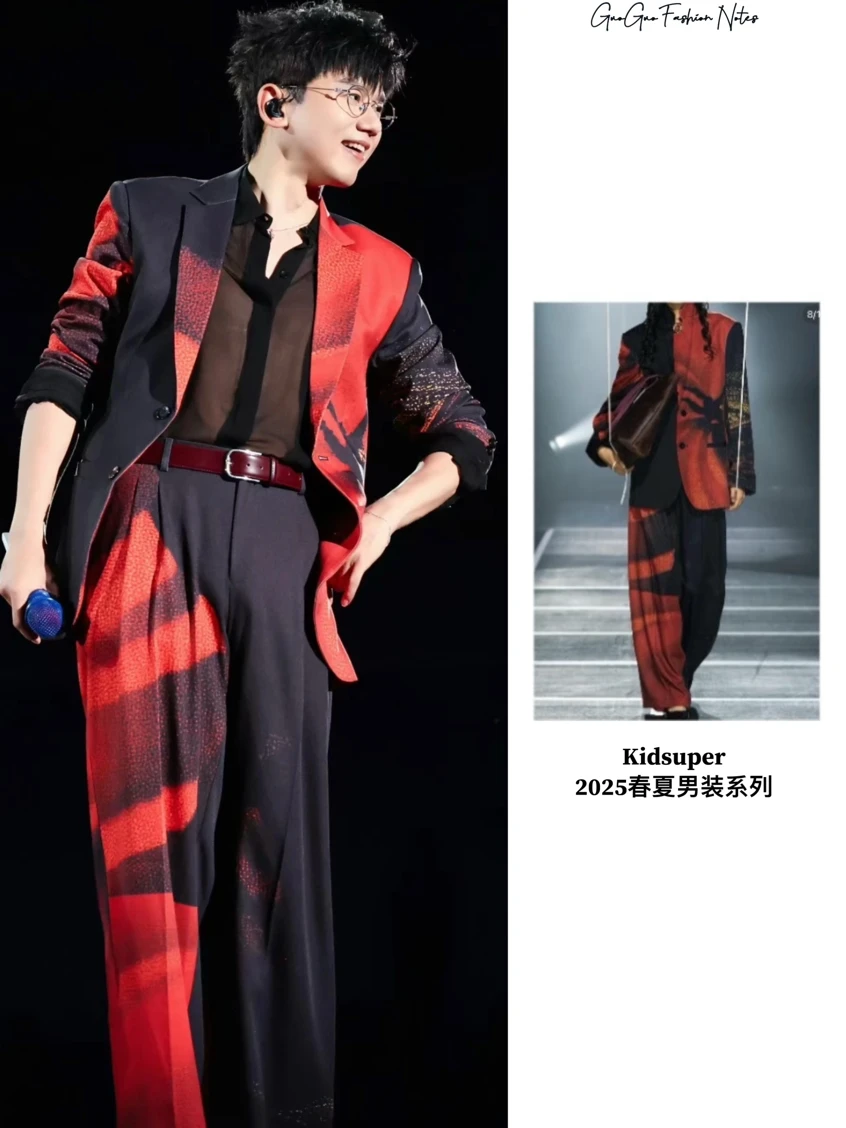 出圈的两套红色战袍也给大家整理出来了,Kidsuper2025春夏系列大胆撞色展现不羁舞台个性,莫根莫订制红蕾丝西装则华丽又复古!
