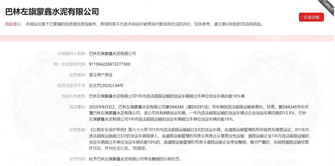 据处罚决定文书(左交罚〔2025〕134号)显示,2025年8月5日,巴林左旗蒙鑫水泥有限公司蒙D66345(蒙DX291挂)号车辆因违法超限运输被查处。经查,蒙D66345号车所属巴林左旗蒙鑫水泥有限公司,该公司共有8辆货运车辆,一年内违法超限运输的货运车辆占企业货运车辆总数的12.5%,巴林左旗蒙鑫水泥有限公司1年内违法超限运输的货运车辆超过本单位货运车辆总数10%。