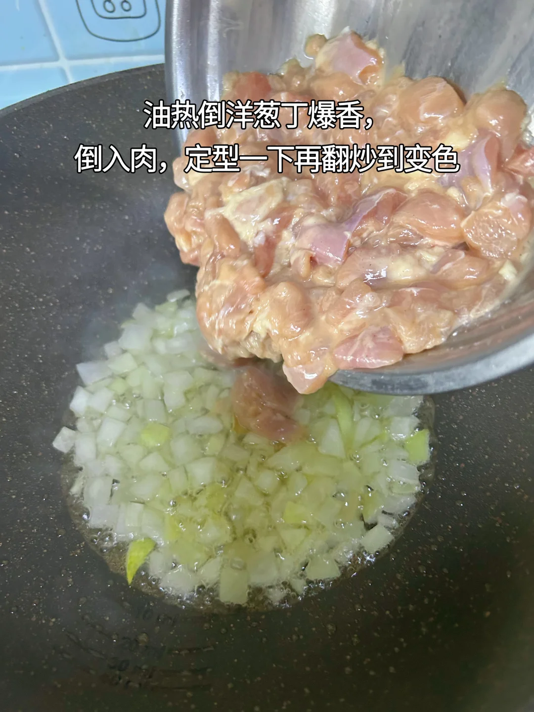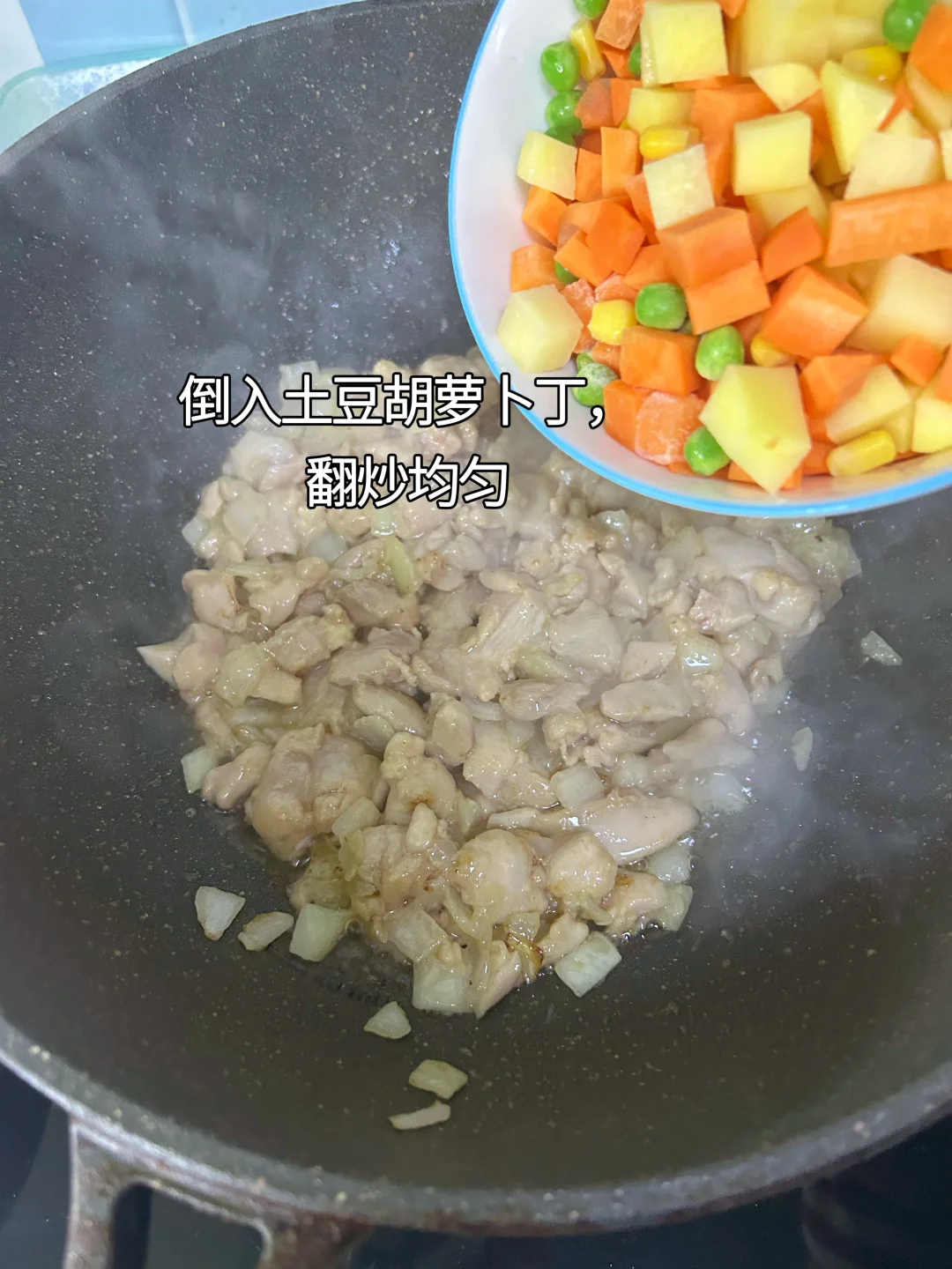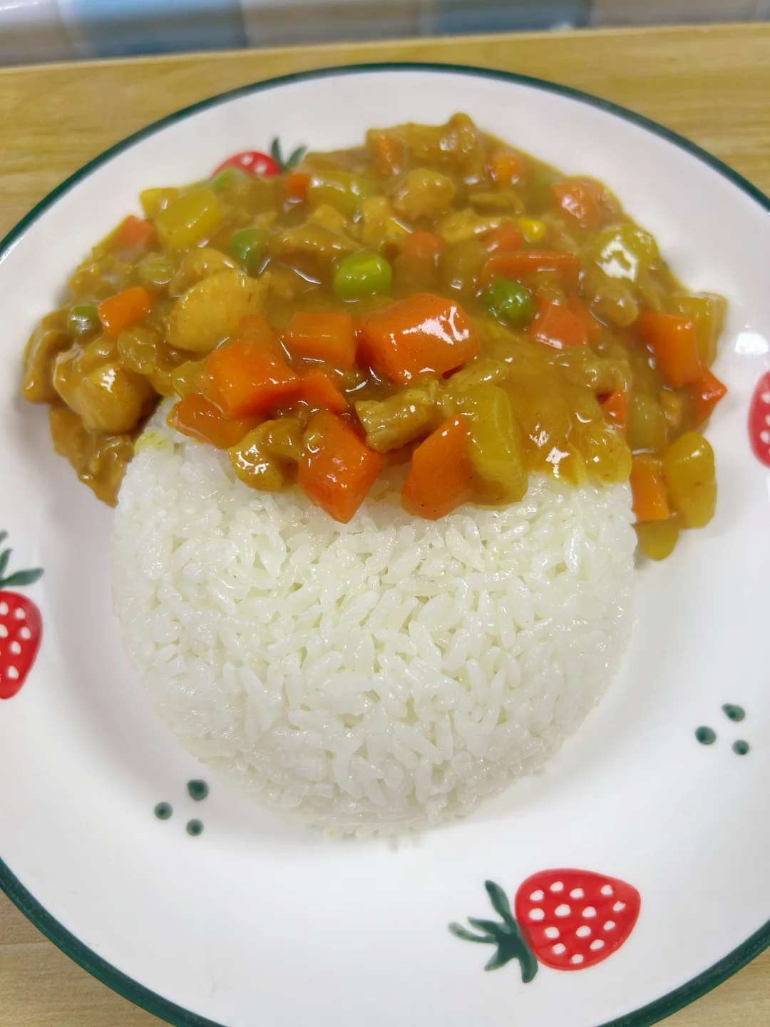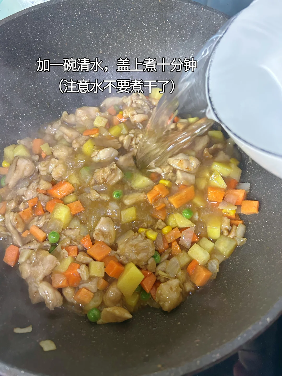 鸡肉咖喱饭 主要材料;鸡腿肉,土豆,胡萝卜,洋葱 主要调味料:咖喱 步骤: 1.鸡腿去骨,切小块,加少许料酒、生抽、胡椒粉、蚝油、生粉抓拌均匀,腌制15分钟。 2.土豆、胡萝卜、洋葱切丁备用,也可以加玉米粒、甜豌豆等。 3.油热下洋葱,炒香,加鸡肉丁,定型几秒再翻炒至变色。 4.加入土豆丁、胡萝卜丁,翻炒均匀。 5.加一碗水没过食材,煮十分钟左右,直到土豆、胡萝卜软烂,注意观察,不要把水烧干。 6.加一块咖喱,盖上盖子,小火煮三分钟,直到咖喱融化。 7.翻炒均匀,即可出锅。出锅前可以淋半勺牛奶/椰浆,咖喱的香味会更柔和,一点不腻。 配上一碗热乎乎的大米饭,鲜香浓郁超下饭,好吃又满足。