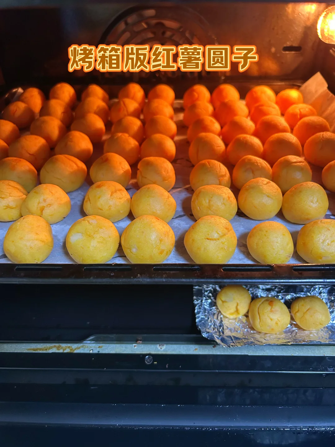 油炸红薯圆子是小时候过年必吃的一道美食,现在的人不愁吃喝,讲究的是少油少盐,吃得健康,这款烤箱版红薯丸子不油腻,放心吃。 1.红薯洗净去皮,切块更容易蒸熟,大概蒸20-30分钟,筷子可以扎透就是好了。 2.加一些白糖,如果红薯特别甜可以不加,趁热压成红薯泥。 3.再加大约五分之一的面粉,拌均匀,揉成团。面粉太多不好吃,少放一点,能成团就行。 4.搓成二十多克一个的小丸子,表面沾薄薄的一层香油,这样烤出来表面更好看也更好吃。 5.烤箱预热,上下火160度烤20-30分钟,中间熟透就行了。 做好密封放在冰箱冷藏一星期内吃完,吃的时候烤、蒸、炸都可以。如果想保存更久,可以冷冻保存几个月。