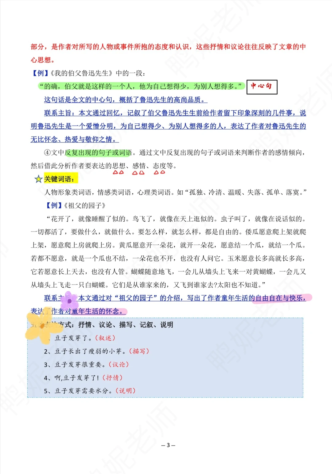 文章的中心思想=主要内容+表达的情感