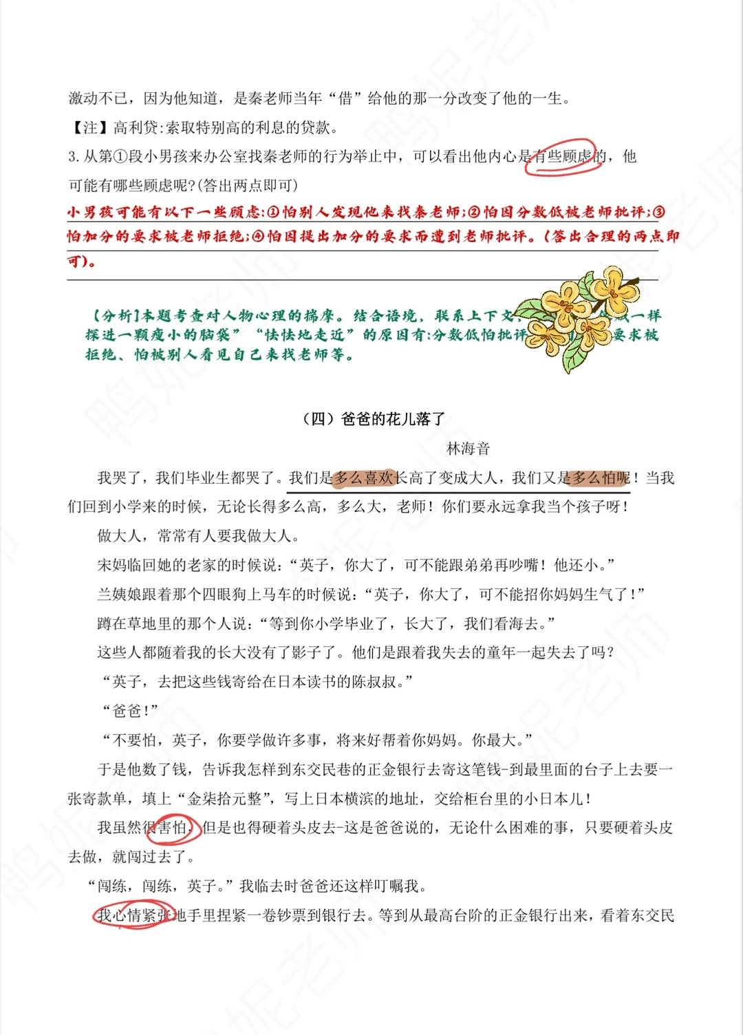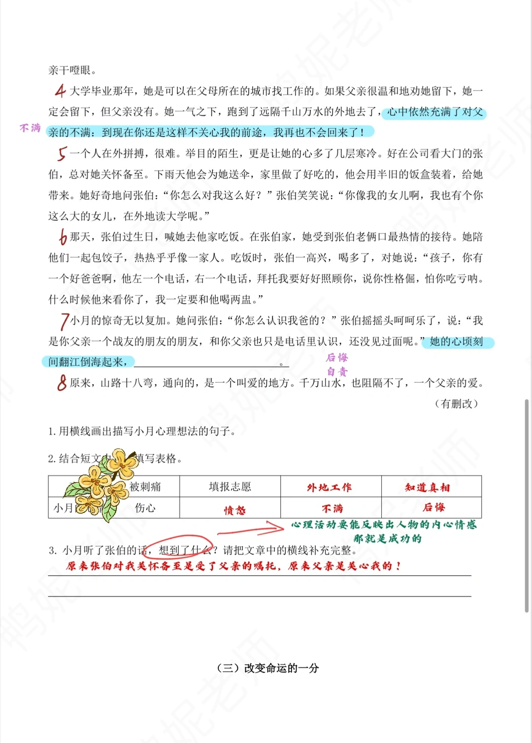 补写人物心理描写时,可依据上述方法揣摩出人物心理进行解答,补写完之后,可将所补写内容代入原文,看是否符合人物的性格特点。