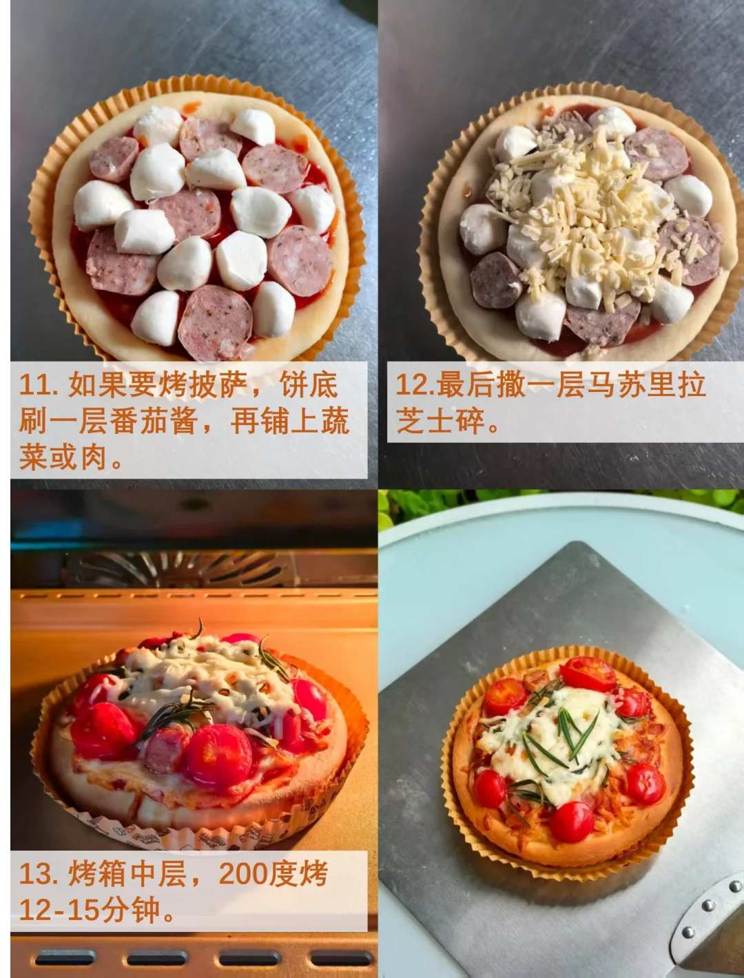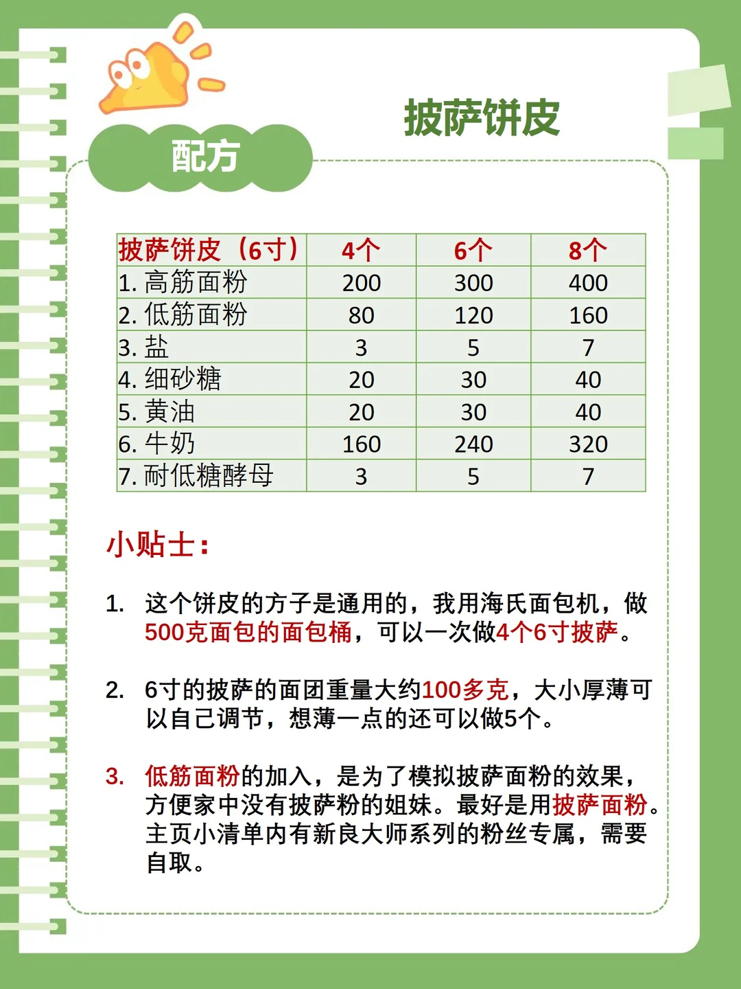 [烟花R]夏天不想开烤箱、不想揉面、不想等发酵?把面包机推出来,它能在45分钟里完成所有粗活:揉面、松弛、基础发酵,一次给你4张标准6寸披萨皮,直径15 cm,薄底脆边,刚好一人食,给孩子早餐备餐太合适了。 [烟花R]配方如图2所示。 4个,6个,8个,我都算好了,想做几个随便用! [烟花R]操作步骤如图7至图10。 1. 全部倒进桶,按“披萨面团”键,机器先慢速成团,再高速甩面,最后恒温发酵,45分钟蜂鸣提示,面团柔软有弹性,戳洞不回缩。 2. 取出轻轻排气,分4等份(每份约45 g),擀成6寸圆片,叉子随意戳洞防鼓包。 3. 稍微发酵一会儿,就放入预热好的烤箱,200度,5分钟,定型差不多就取出,不要烤太久,后期做披萨还要烤。 4. 完全冷却后,装进密封袋,放入冰箱冷冻,冷冻可存3个月左右 5. 想吃的时候提前5到10分钟取出解冻即可,抹酱、撒芝士、堆料,200 ℃上下火10到15分钟,边缘金黄卷曲,底部酥到咔嚓,芝士拉丝30 cm。 [烟花R]一张饼皮成本不到1块钱,却换来一周随时随地的披萨自由。下班后懒得做饭?从冷冻室抽一张,10分钟就能端出热乎的私人定制披萨。面包机不是鸡肋,只是你没让它干对活!