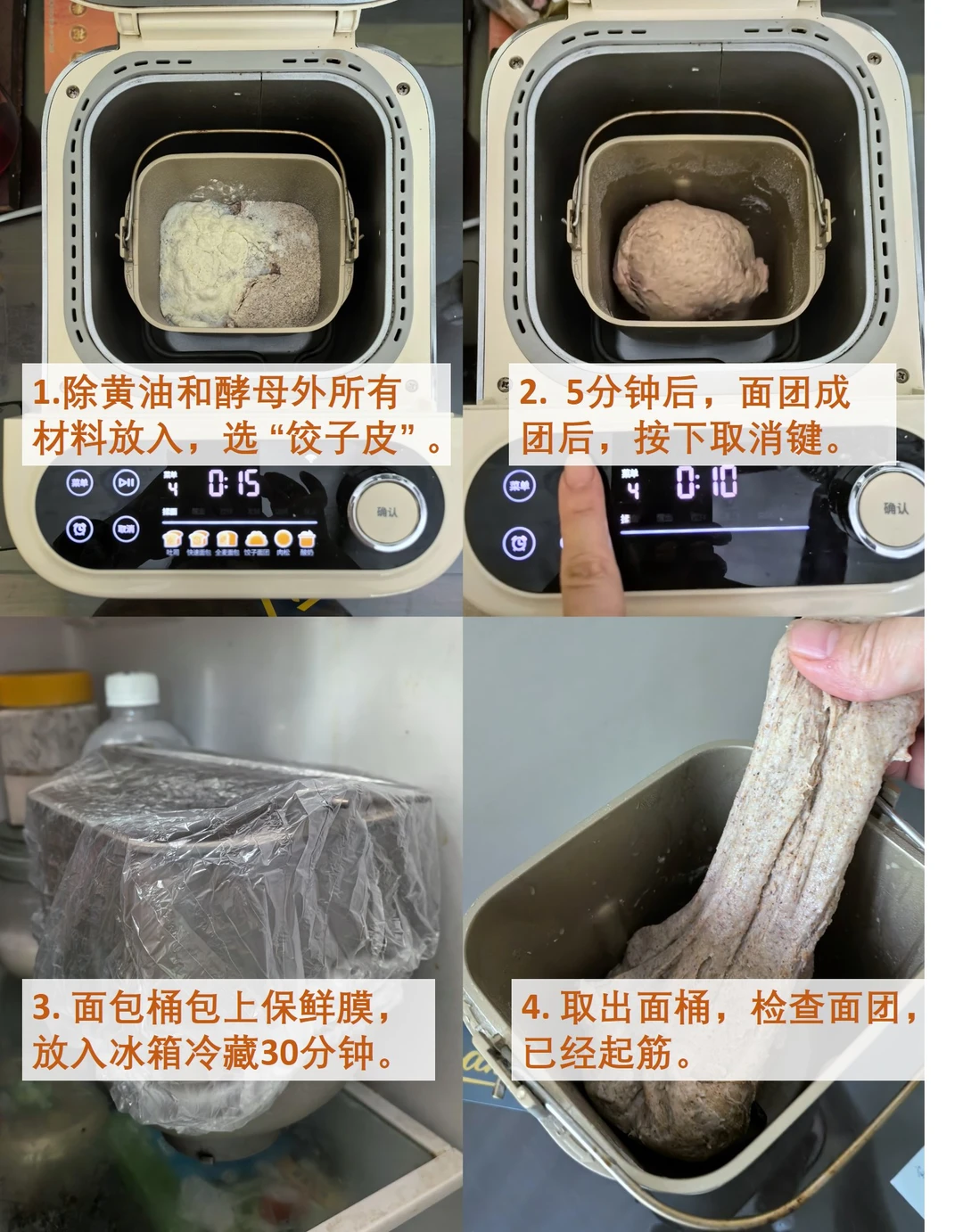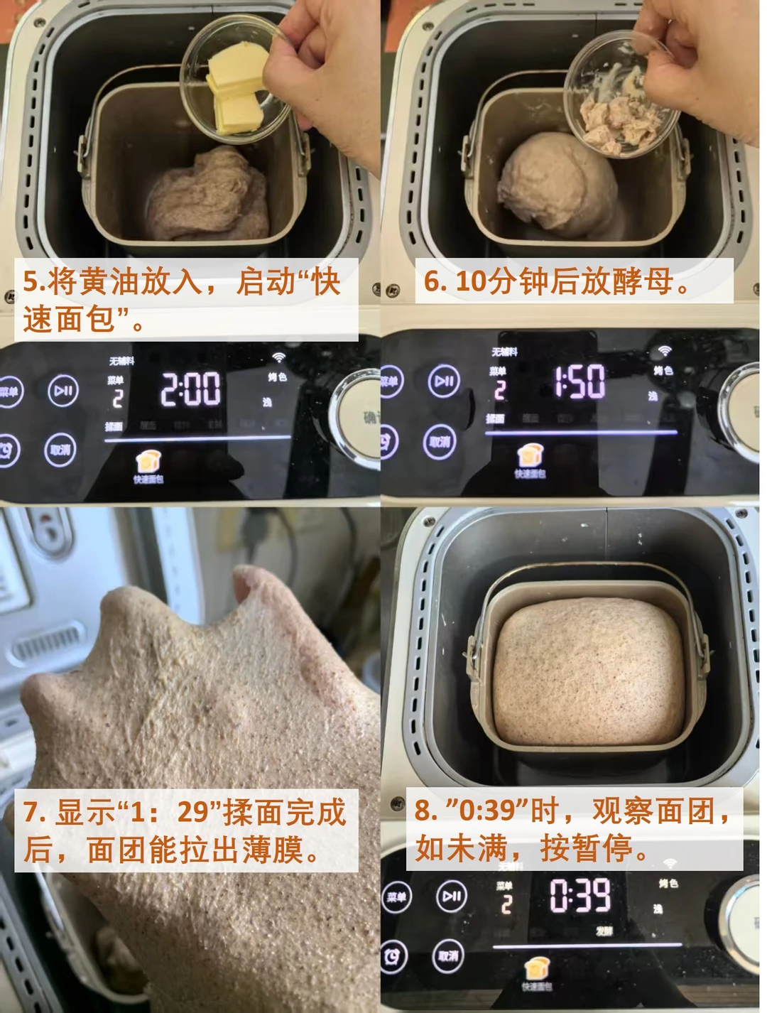 操作步骤如图6-8,图示是用海氏面包机做的,用了“饺子皮”和“快速面包”菜单。