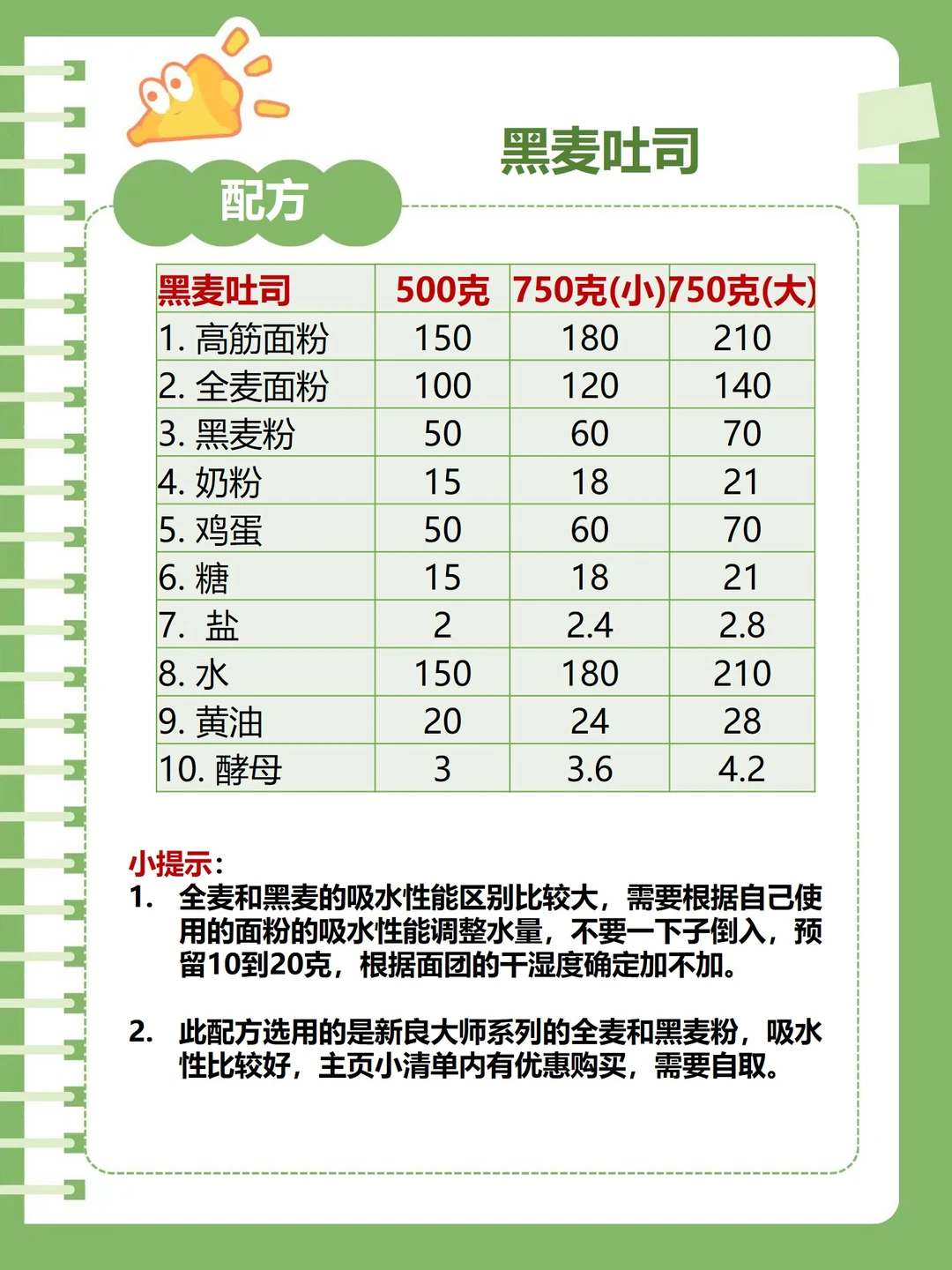 全麦和黑麦的吸水性要高于高筋面粉,但是不同品牌的吸水性相差很大,一定要控制好水量,不要一下子倒入。图示配方中选用的是新良大师系列的全麦和黑麦粉,吸水性比较好,如果用其他的,要自己调节好水量,面团千万别太湿,否则发酵困难。我主页小清单里有新良大师系列的各类面粉,有粉丝专属,需要可自取。