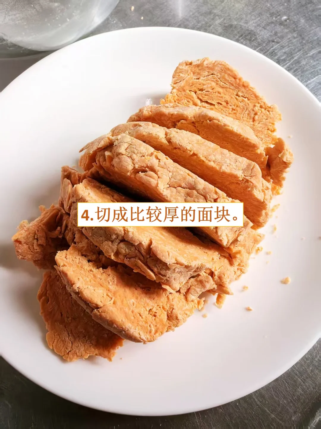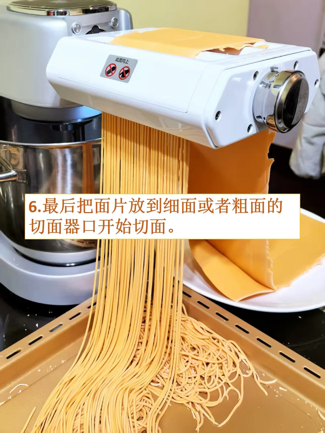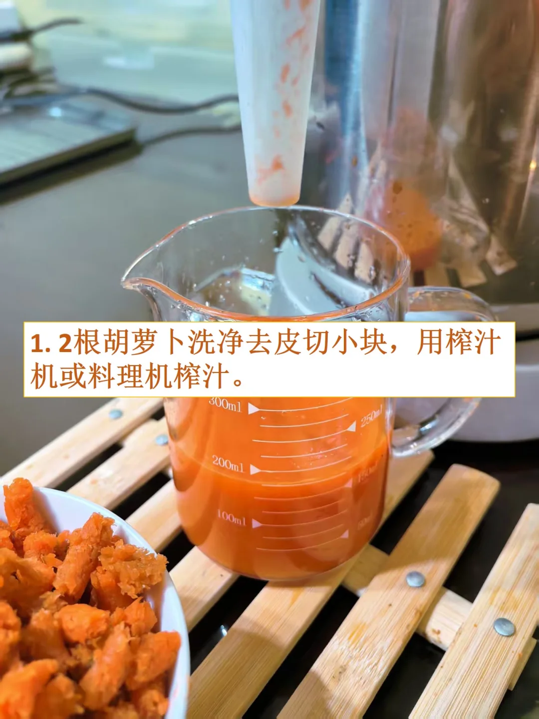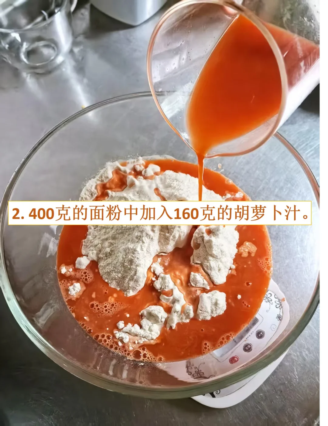 [庆祝R]宝宝不爱吃胡萝卜怎么办,试试这个!胡萝卜挂面!不仅外观好看,能增加食欲,而且富含维生素A,眼睛和免疫力很有好处,没有添加剂,适合宝宝的辅食,也是大人们健康饮食的绝佳选择! [庆祝R]一次多做点,将面条晾干可以保存很久,不用担心变质,一周的辅食和健康早餐轻松搞定,再也不用天天准备啦! [庆祝R]适合人群:宝妈宝爸、减肥人士、上班族和.老人 [彩虹R]配方: 中筋面粉:400克 胡萝卜汁:160克(大约2根胡萝卜) 盐:2克 [彩虹R]制作步骤: 1. 胡萝卜洗净去皮切小块,用榨汁机或料理机榨汁。 2. 400克的面粉中加入160克的胡萝卜汁。 3. 用筷子搅拌成絮状,再用手团成面团。(注意:面团比较硬和干,用点力勉强能捏到一起即可。) 4. 切成比较厚的面块。 5. 把切好的厚面片放到压面机上面压, 我用的厨师机压面器,厚度调节器有8档厚度,先从1档薄面片开始,开始压出来的面片比较粗糙,要多压几次,面片就光滑成大片了。 6. 逐渐过渡到6档,面片越来越薄,厚度可以根据自己需要选择。 7. 最后把面片放到细面或者粗面的切面器口,就开始切面了。 8. 把切好的面条用衣架挂起来,放到通风的地方晾干。 9. 晾干好的面条切断,放盒子中可以保存很久,不用担心变质。