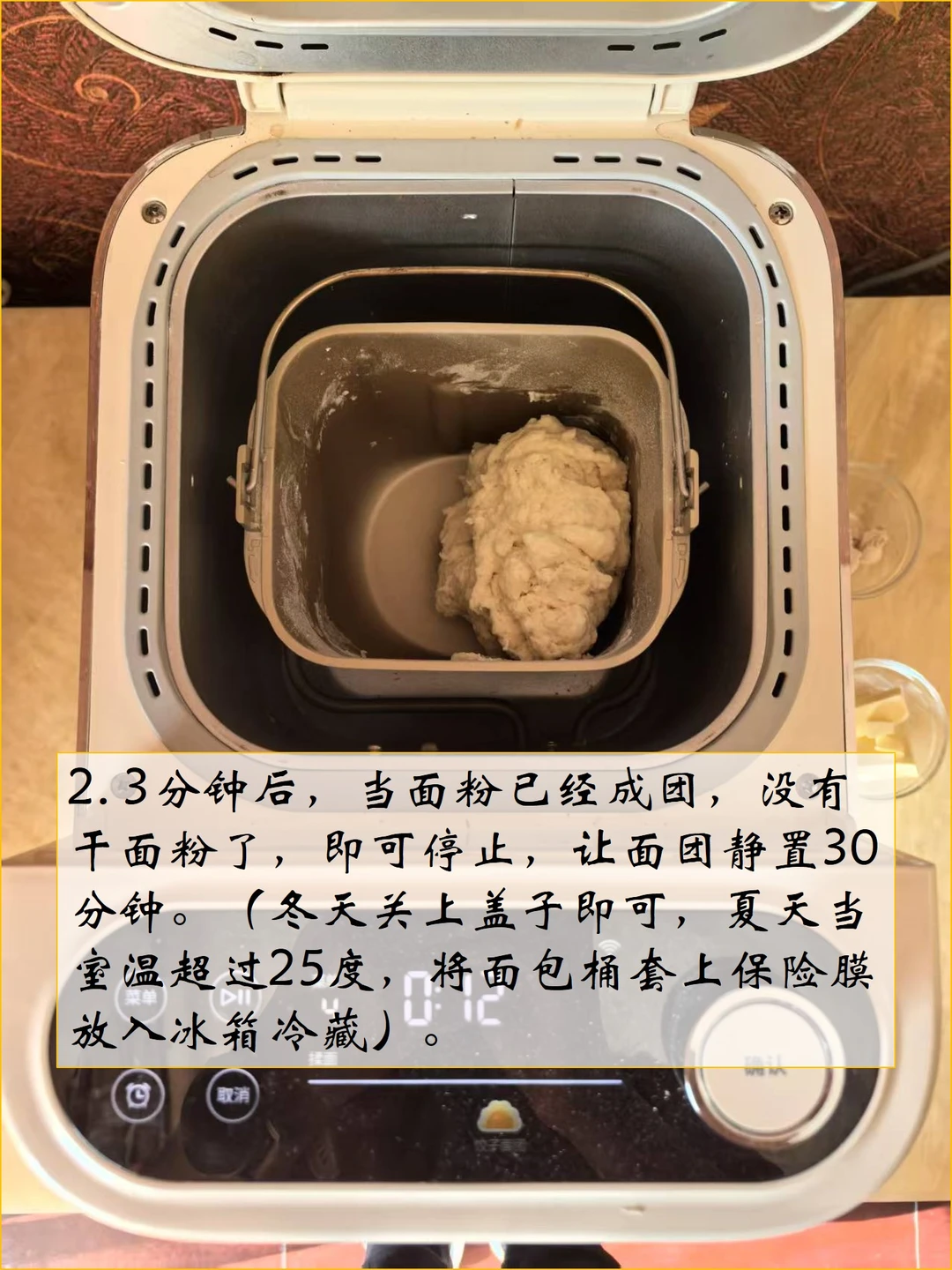 [二R]面包机揉面的关键在于时间和温度的把控。面包机功率小于厨师机,揉面时间长一点,大约30到40分钟。揉面时间长容易造成面团温度升高,导致酵母失活。解决办法就是让面团初步成型后静置30分钟,相当于水合,这样做可以大大减少揉面时间,这个方法其实用厨师机也会采用。而后加酵母的做法也是为了避免酵母在面包桶内提前发酵,这个是不同于厨师机的,需要注意。