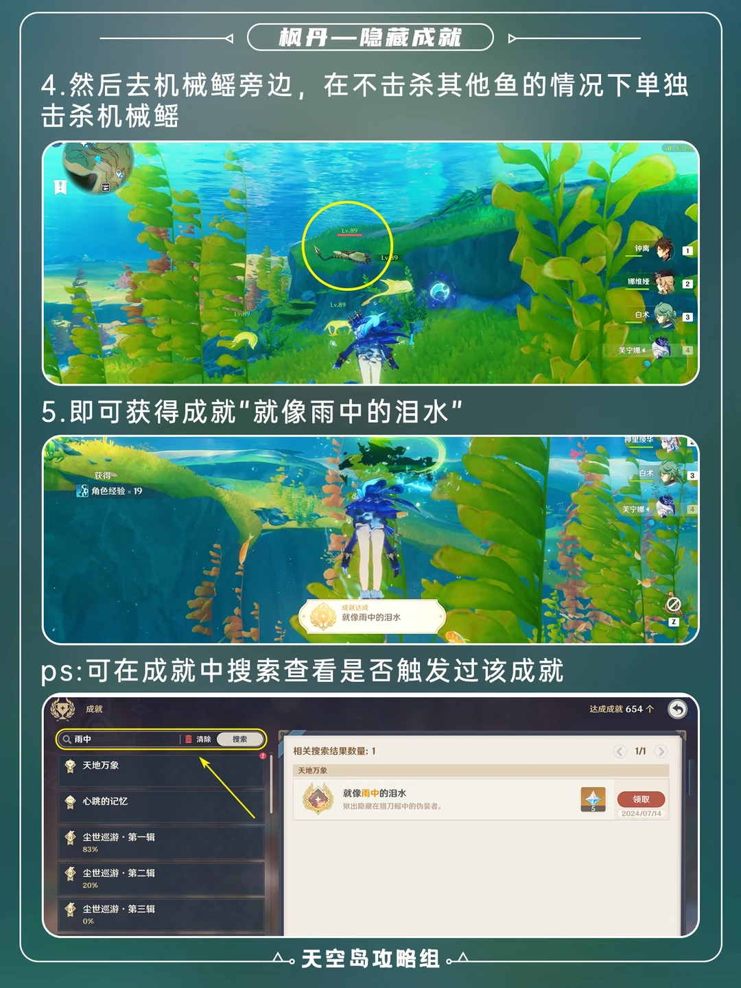 枫丹隐藏成就「就像雨中的泪水」攻略[哇R] 传送到塔拉塔海谷,单独击杀机械猎刀鳐即可 ✨注意不要击杀其他鱼,即可获得成就!