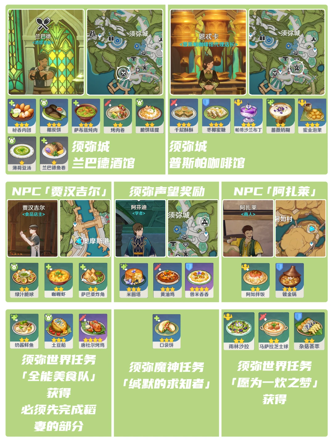 须弥地区食谱全收集![哇R]看看你集齐了嘛? 通过在兰巴德酒馆、普斯帕咖啡馆、贾汉吉尔、阿如村阿扎莱处购买 并且完成须弥声望与魔神任务和世界任务简单集齐[飞吻R]