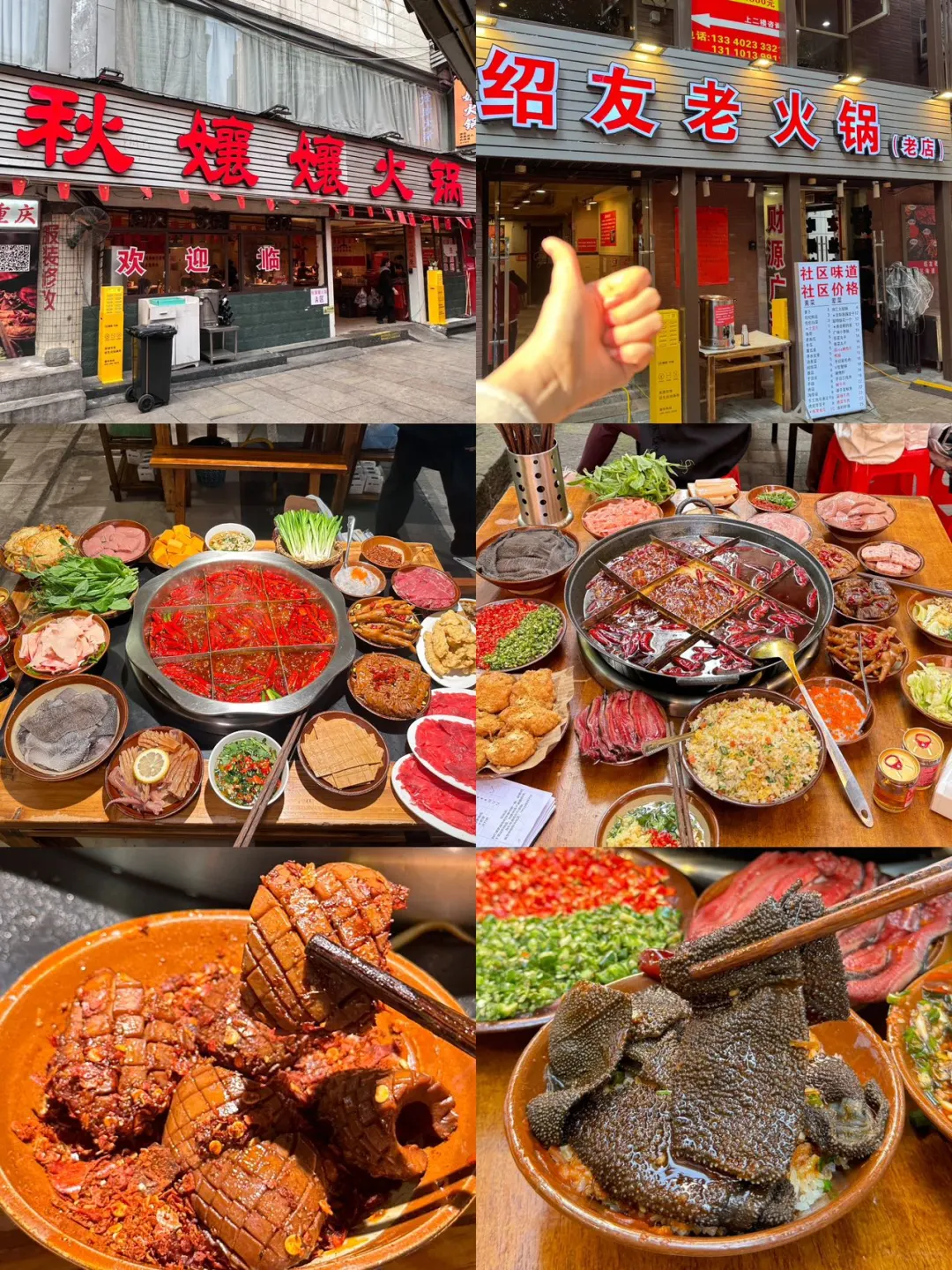 🩷绍友老火锅(老店):这家真是本地人带路才找得到的重庆火锅!锅底是老师傅亲手炒的,隔条街都闻到香,越煮越入味,涮个毛肚鸭肠简直不摆了