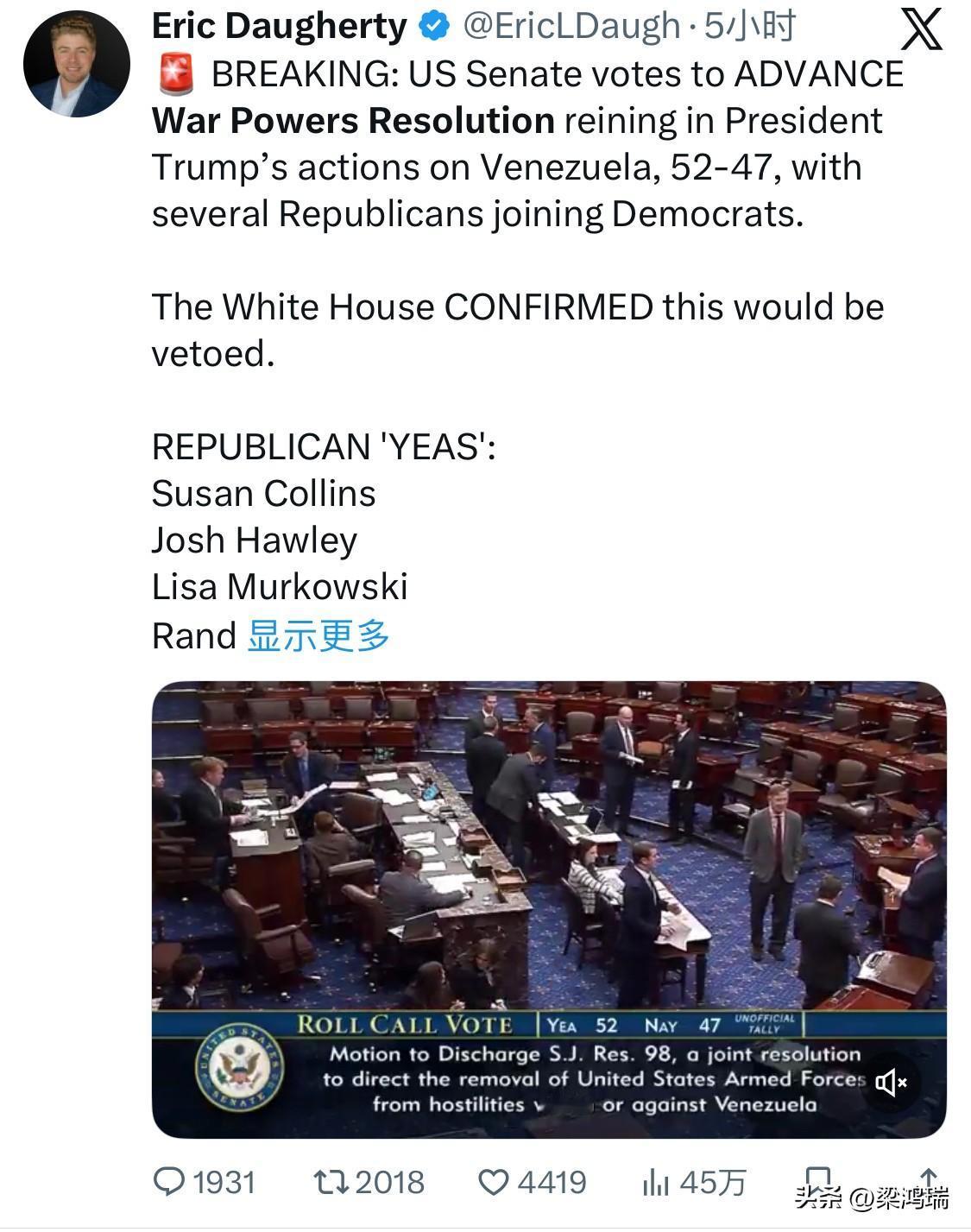 2026年1月8日,美国国会参议院以 52比47 的投票结果,通过了一项针对委内瑞拉的《战争权力决议》(War Powers Resolution)程序性表决,旨在限制总统特朗普在未获得国会授权的情况下对委内瑞拉采取进一步军事行动。 以下是此次投票及相关背景的关键信息: 1. 投票详情 投票结果: 52票赞成,47票反对。 跨党派支持: 全体民主党参议员以及 5名共和党参议员 投了赞成票。 倒戈的共和党人: 兰德·保罗(Rand Paul)、苏珊·柯林斯(Susan Collins)、丽莎·穆尔科斯基(Lisa Murkowski)、乔什·霍利(Josh Hawley)和托德·扬(Todd Young)。 2. 决议背景与目的 直接诱因: 此项决议是在美军突袭并抓捕委内瑞拉领导人尼古拉斯·马杜罗(Nicolás Maduro)几天后提出的。 核心内容: 要求总统在对委内瑞拉境内或针对委内瑞拉进行敌对行动前,必须获得国会的明确授权。 特朗普政府立场: 特朗普在社交媒体(Truth Social)上对倒戈的共和党人表示强烈不满,认为此举削弱了美国的防御能力,并声称该决议违宪。 3. 后续立法流程 性质: 目前通过的是一项程序性动议(Motion to Discharge),为接下来的全面审议铺平了道路。 障碍: 虽然该决议预计下周将在参议院获得最终通过,并送往众议院,但即便两院均通过,特朗普极具可能行使总统否决权。由于目前的支持率未达到推翻否决权所需的三分之二多数,该决议最终成为法律的可能性较低。
