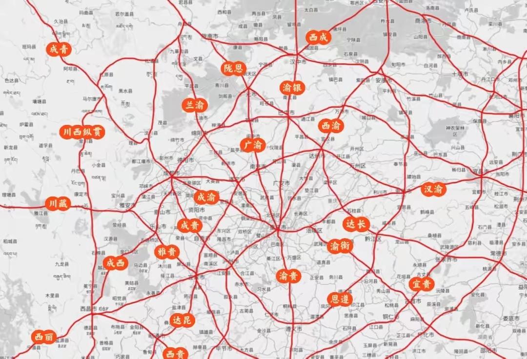 这张图是不是重庆设计的?基本上都是以重庆为放射状的发展路径,如银渝、西渝、汉渝、渝贵、渝衡、成渝、兰渝、广渝和渝昆等多条线路,而成都虽然地理条件较为偏西,但不应该只有这几天放射线路,而且也从来没有达昆、宜贵、恩遵、西贵这些环重庆高铁环线。