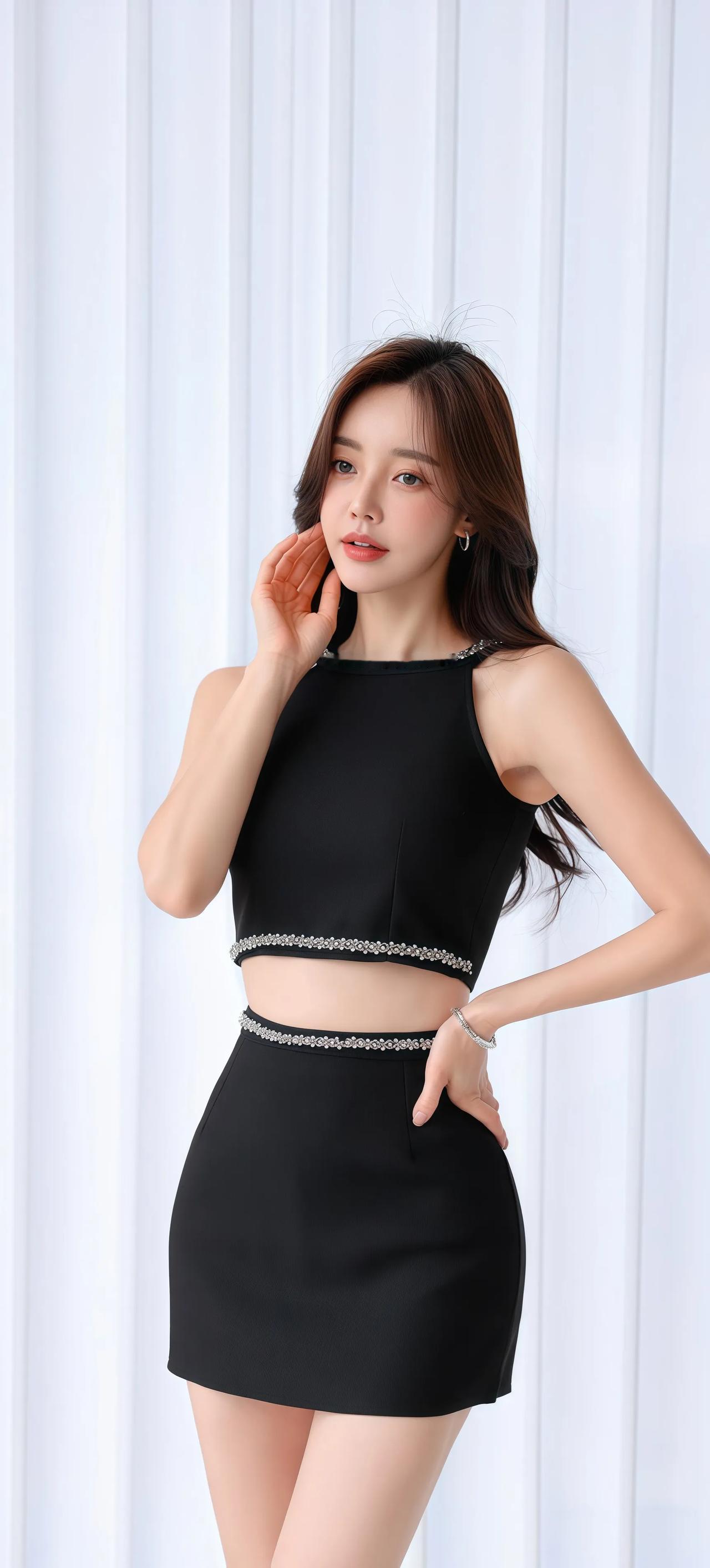 黑色露脐装搭配短裙,闪耀的装饰细节,尽显优雅与性感!