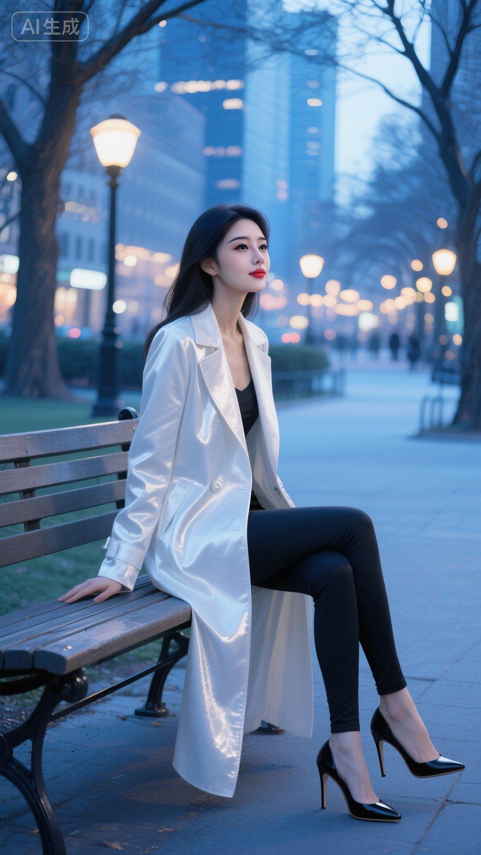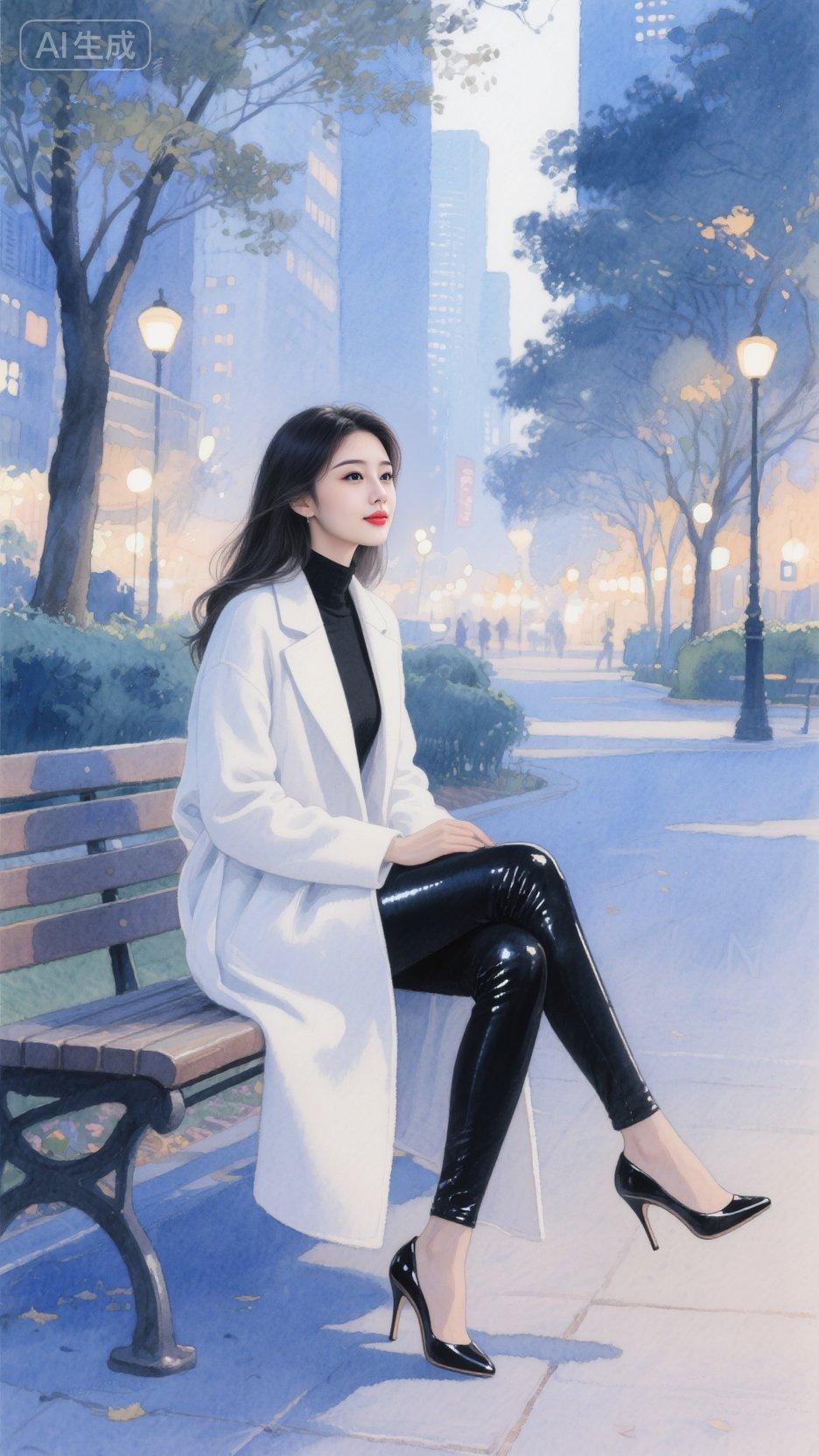 冬日森林中的时尚穿搭,毛绒外套与黑色皮裤的完美结合,尽显优雅与温暖。