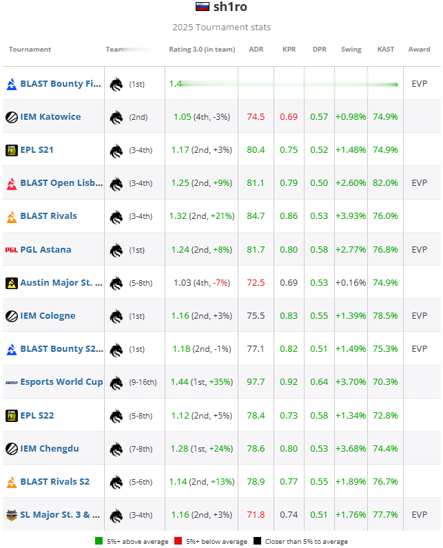 接下来是BLASTRivals第一赛季,sh1ro再次与EVP提名失之交臂,尽管他以1.32rating(仅次于donk的1.37rating,位列全场第二)结束了赛事。这部分是因为他的rating因对阵FlyQuest和Wildcard的三张出色地图(两张2.28rating和一张1.93rating的地图)而提升,而在对阵Falcons和Vitality的竞争加剧时,他未能锁定EVP。