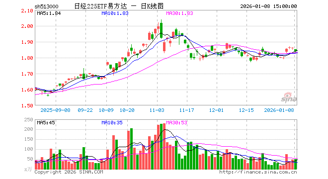 1月8日,日经225ETF易方达(513000)跌1.08%,成交额9262.13万元。当日份额增加50.00万份,最新份额为9.28亿份,近20个交易日份额增加1650.00万份。最新资产净值计算值为16.50亿元。