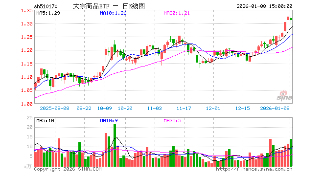 1月8日,大宗商品ETF(510170)跌0.98%,成交额1842.39万元。当日份额增加200.00万份,最新份额为2.61亿份,近20个交易日份额增加1000.00万份。最新资产净值计算值为3.41亿元。