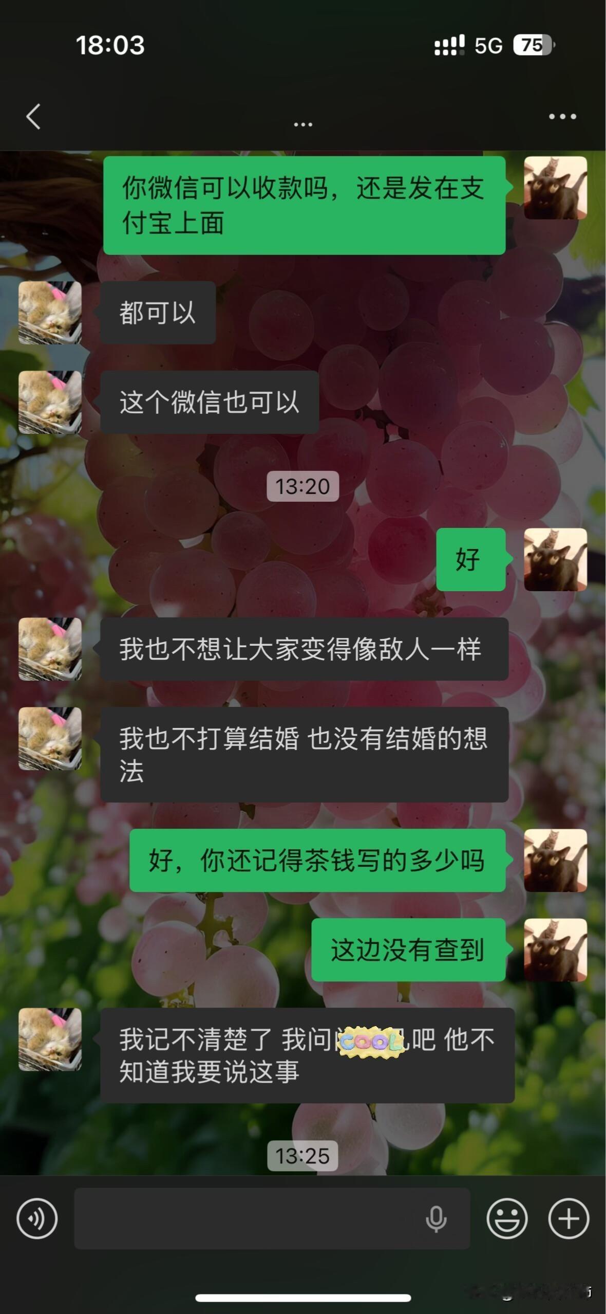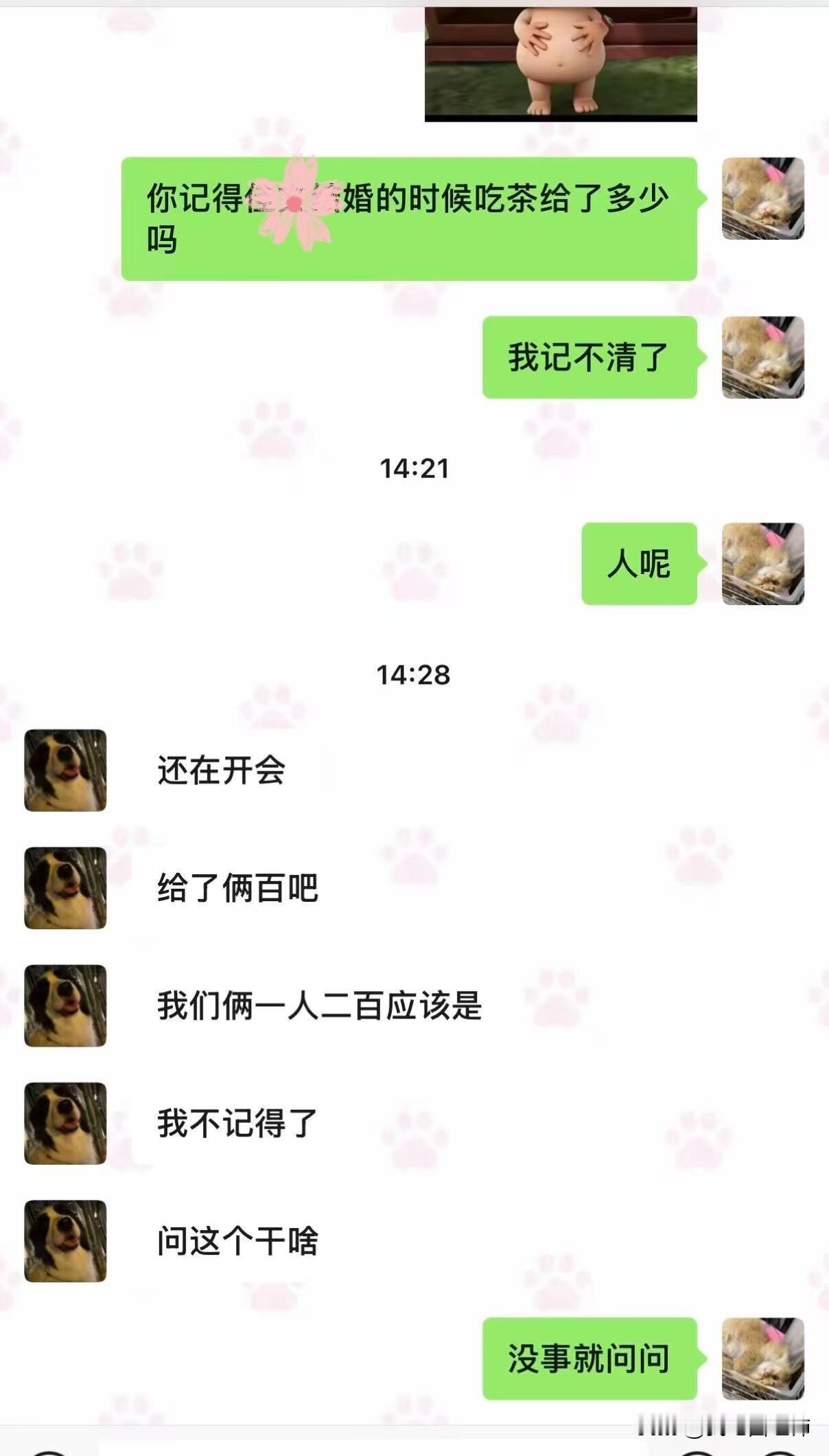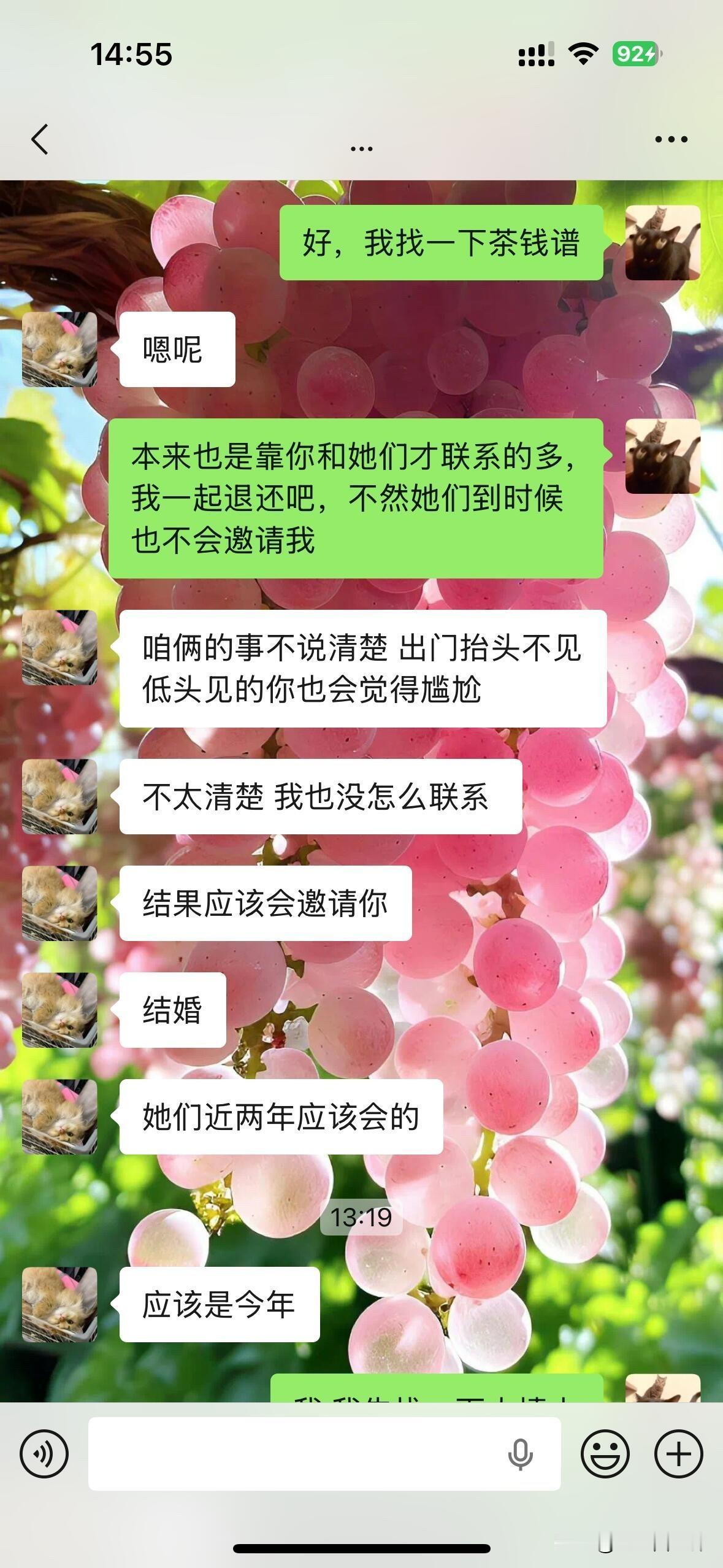 闹掰的朋友要求退还份子钱,求帮忙支招 和曾经闺蜜闹掰了,她发消息叫我返还当年人情,我返还了,但是她说的茶钱,她自己也记不清是多少钱,茶钱本上没有她的名字只查到她对象的姐姐,和她对象的表妹一人写的一百……茶钱本和人情本是分开的,上了礼的都有记录在册,她说写了但是真没找到,本人也不记得当初她写没写,她说问她男朋友,她男朋友说应该是一人两百,也记不清了,最后还是返还了四百 人物关系:她和她对象,她对象的表妹,她对象的亲姐姐,之前都是朋友关系,后面和她闹掰有点尴尬就都不怎么联系了(她对象是我老家本地的,认识她之前也认识她对象,但是不熟没来往的那种)(我邀请她们三个女生做伴娘,有给伴手礼和红包) 过程:她和他对象从19年开始谈,她是外地,我家跟他男朋友和她男朋友的表妹家都挨得很近,她男朋友表妹住我家后面,她男朋友家步行大概几百米的样子,每年过年都有去她们家拜年来往,互相家里人都认识,平时出门买菜也可能碰到,闹掰那会是想着他们结婚直接把人情以转账形式给她们,或者上了礼就走,她现在发消息说没有结婚的打算了,她对象家里催婚,(目前猜测俩人走不到最后) 她对象的姐姐,和她对象表妹:她们俩互相有对象,估计年底会结婚,但是我怀孕期间和她们也很少来往了,本想把钱一起退还,但是我和她闹掰的事她们都还不知道,她们年底可能会结婚,所以干脆等她们发朋友圈结婚或者邀请我再退还 求助:她和她对象不准备结婚,俩人异地恋了一整年,也没有分手,但她们俩人共同上的礼钱和茶钱我已经退还给她个人了,她男朋友还不知道,(截图有写,她也没准备告诉她男朋友)由于和她男朋友家挨得比较近,怕她男朋友以后要是和别人结婚,再叫我过去随礼……(别人上了礼不管怎么样都该还那是应该的)但是我都退还了肯定是不愿意再随礼,又怕她男朋友和她男朋友的家里人以为我不还人情,平时在老家出门也能碰到,怕被人在背后戳脊梁骨,我现在该怎么办呢?这礼钱是她们俩共同上的,跟他对象没发过消息,突然跟人讲又感觉莫名其妙,很冒犯,不讲又担心人家不知道,以为我占便宜…