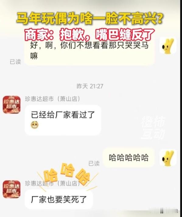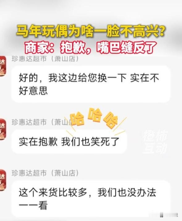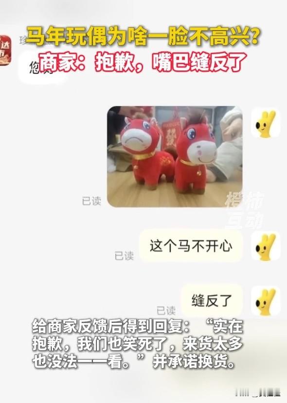 客户笑疯了,超市笑到直不起腰,厂家看了也差点笑喷!杭州网友买的马年红马玩偶,居然成了全网笑点担当。 本来冲着喜庆买的新年玩偶,结果到手的小马耷拉着嘴,一脸委屈巴巴的模样,跟旁边咧嘴笑的同伴比,活脱脱像受了委屈的小朋友。赶紧找超市客服反馈,说这马咋一脸不开心,客服一看也乐了,直说“实在抱歉,我们也笑死了”,还坦白是工厂把小马的嘴巴缝反了,来货太多没挨个检查。 客服还把这只“委屈马”的照片发给厂家,厂家看了也笑个不停,最后还爽快答应给网友换货。这只缝反嘴的小马,明明是做工失误,却凭一己之力戳中了所有人的萌点,网友都调侃它是“马年第一只emo小马”,反倒比正常款更招人喜欢了!