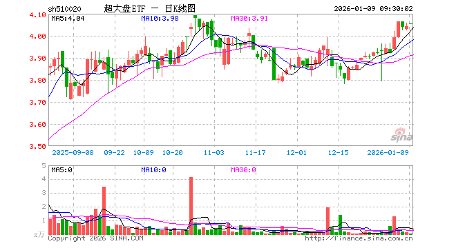 1月9日,超大盘ETF(510020)开盘涨0.37%,报4.056元。超大盘ETF(510020)重仓股方面,寒武纪开盘跌1.66%,海光信息跌1.52%,紫金矿业跌0.83%,中芯国际跌0.77%,恒瑞医药跌0.03%,赛力斯跌0.02%,万华化学涨0.39%,农业银行跌0.27%,中信证券涨0.00%,中国船舶涨0.20%。