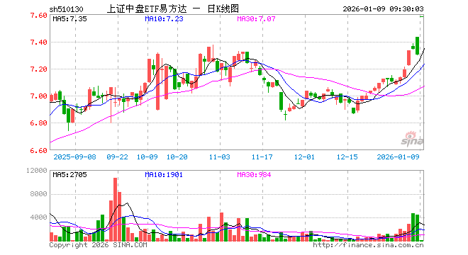 1月9日,上证中盘ETF易方达(510130)开盘涨3.85%,报7.580元。上证中盘ETF易方达(510130)重仓股方面,工业富联开盘跌1.35%,中科曙光涨0.00%,江苏银行涨0.00%,兆易创新跌1.62%,浦发银行涨0.17%,北方稀土跌0.43%,福耀玻璃涨0.57%,华泰证券跌0.21%,民生银行跌0.26%,华友钴业跌1.48%。
