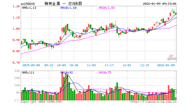 1月9日,稀有金属ETF(159608)开盘跌0.88%,报1.126元。稀有金属ETF(159608)重仓股方面,北方稀土开盘跌0.43%,洛阳钼业跌1.06%,华友钴业跌1.48%,盐湖股份跌1.46%,赣锋锂业跌0.80%,天齐锂业跌1.40%,中国稀土跌0.12%,中矿资源跌0.52%,盛和资源跌0.09%,西部超导涨0.60%。