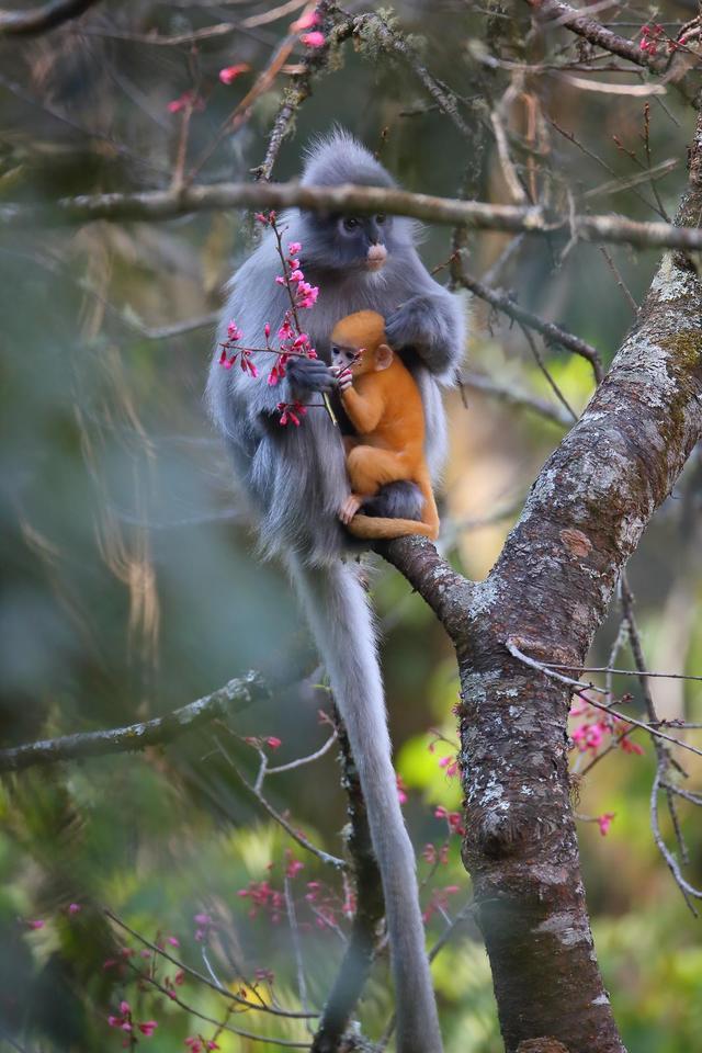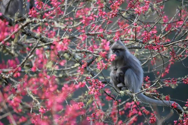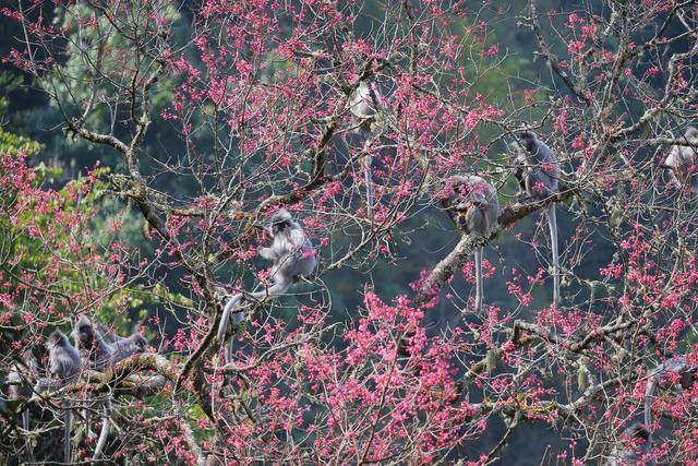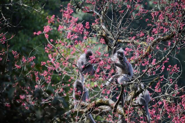 每年11月至次年1月,冬樱花在云南无量山国家级自然保护区景东片区里盛开。国家一级重点保护野生动物印支灰叶猴携家带口采食樱花,这样的场景,总能吸引摄影爱好者去拍摄。