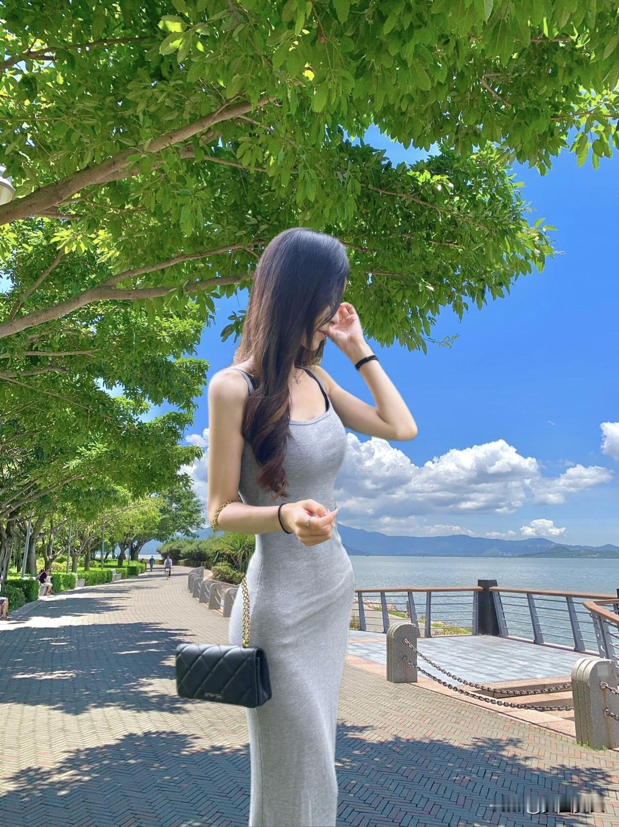 海边漫步,清新连衣裙与碧海蓝天相映成趣。