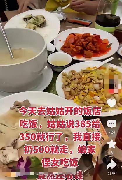 泪目!一女子带朋友去姑姑开的饭馆吃饭,买单时,姑姑说385块给350块就行了。女子听后有些气愤,扔下500块就走了。事后,女子也是气得流眼泪,说娘家侄女去姑姑店里吃饭还要收钱,她真的想不通,还将姑姑拉黑!姑姑:她怎么就不懂我呢? 那天周末,小琳约了三个好友直奔姑姑的饭馆,一进门就大声喊着姑姑,还特意跟朋友介绍“这是我亲姑姑开的店,菜味绝对正宗”。 姑姑见侄女带朋友来,脸上笑开了花,亲自过来招呼,还额外送了一盘自家腌的酱黄瓜,嘱咐后厨菜量给足点。 几个人边吃边聊,桌上的红烧鱼,辣子鸡吃得一干二净,全程氛围热热闹闹,小琳心里也挺有面子,觉得没白带朋友来。 等到结账的时候,服务员拿着账单过来说385块,小琳刚要掏钱,姑姑就从后厨走出来,摆了摆手说“自家人客气啥,零头抹了,给350就行”。 这话一出口,小琳脸上的笑容瞬间僵住了,当着朋友的面,她觉得脸颊发烫,心里像被泼了冷水。 在她的想法里,亲姑姑怎么着也该客气地说一句“这顿我请了”,就算不请,也不该明晃晃地收钱,而且还是在朋友面前,这让她觉得特别没面子。 没等姑姑再说什么,小琳从包里掏出500块往柜台上一放,拉着朋友就往外走,连找零都没要。 一路上朋友没好意思多问,可小琳心里的委屈越积越多,回到家后,眼泪忍不住掉了下来。 她翻着手机里和姑姑以前的合照,越想越想不通:自己明明是去给姑姑捧场,带着朋友去增加人气,怎么亲姑姑还真的收钱?就算要收,也不该当着外人的面,就不能给她留点面子吗? 越想越气的她,直接把姑姑的微信和电话都拉黑了,甚至跟家里人抱怨“以后再也不去她店里了”。 而姑姑那边,看着小琳决绝的背影,手里攥着那500块钱,眼圈也红了。 她对着服务员叹气,嘴里反复念叨“她怎么就不懂我呢”。 这家小饭馆看着热闹,其实都是辛苦钱,每个月的房租、水电、食材成本压得她喘不过气,有时候忙一整天也赚不了几十块。 小琳来吃饭,她特意让后厨用的都是新鲜食材,菜量比平时多了近一半,送的酱黄瓜也是自己凌晨起来腌的,想着抹掉35块钱的零头,既是亲情的体现,也实在没多少利润可赚。 她以为侄女能明白自己的难处,没想到会闹成这样。 姑姑的饭馆里,大部分都是附近的老顾客,靠的就是薄利多销维持生计,就像很多小本经营的餐馆一样,房租和人工成本占了营收的大半,根本经不起频繁的免费招待。 她不是不想请侄女吃饭,只是开饭馆就是为了谋生,要是每个亲戚来都免费,生意根本撑不下去。 她原以为自己主动打折已经是尽了亲情,却没料到会戳中侄女的面子,更没想到会被拉黑。 一顿385块的饭,姑姑看到的是生计压力下的亲情让步,侄女看到的是亲人间不该有的明码标价。 没有谁刻意做错什么,却让好好的亲情生了隔阂,就像生活里很多亲属间的矛盾一样,根源不过是彼此站在了自己的立场,没读懂对方背后的难处。