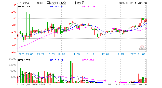 1月9日,截止午间收盘,MSCI中国A股ETF基金(512360)涨0.60%,报1.844元,成交额57.87万元。MSCI中国A股ETF基金(512360)重仓股方面,贵州茅台截止午盘涨0.43%,宁德时代涨0.05%,工业富联涨0.23%,招商银行跌0.82%,长江电力跌0.26%,寒武纪跌0.37%,紫金矿业涨2.51%,海光信息涨1.08%,中国平安跌1.99%,比亚迪涨0.35%。