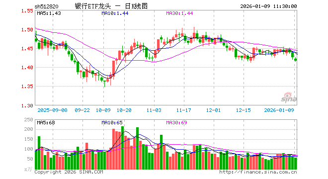 1月9日,截止午间收盘,银行ETF龙头(512820)跌0.70%,报1.416元,成交额8234.14万元。银行ETF龙头(512820)重仓股方面,招商银行截止午盘跌0.82%,兴业银行跌0.57%,工商银行跌0.26%,农业银行跌0.54%,交通银行跌0.28%,江苏银行跌0.95%,浦发银行跌0.35%,平安银行跌0.52%,民生银行涨0.00%,上海银行跌1.11%。