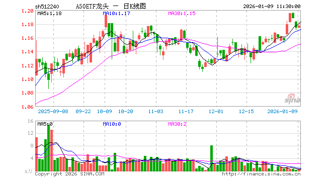 1月9日,截止午间收盘,A50ETF龙头(512240)涨0.26%,报1.177元,成交额40.71万元。A50ETF龙头(512240)重仓股方面,宁德时代截止午盘涨0.05%,贵州茅台涨0.43%,中国平安跌1.99%,招商银行跌0.82%,紫金矿业涨2.51%,美的集团涨0.67%,长江电力跌0.26%,立讯精密涨1.07%,恒瑞医药跌0.69%,比亚迪涨0.35%。