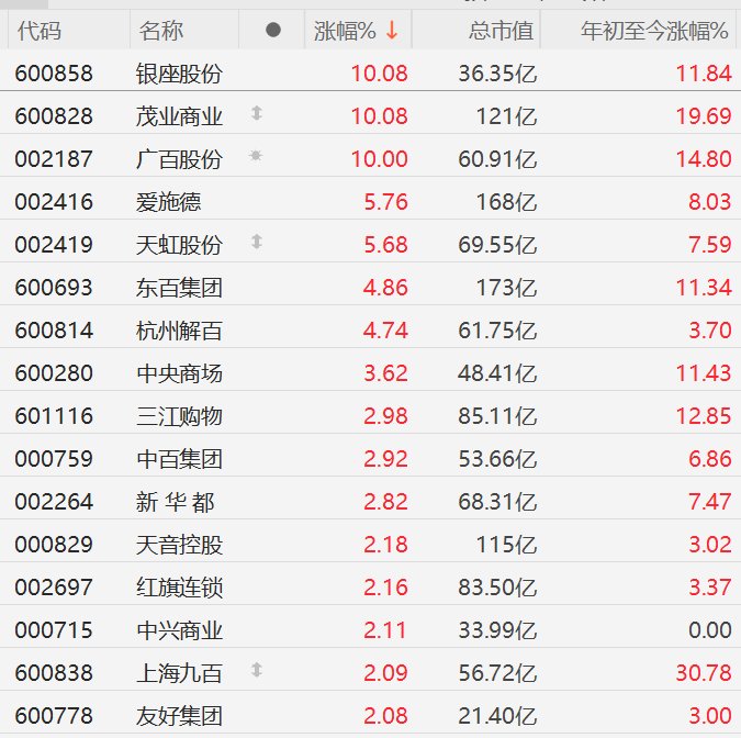 格隆汇1月9日|A股市场零售股走强,截至半日收盘,银座股份、茂业商业、广百股份10CM涨停,爱施德、天虹股份涨超5%,东百集团、杭州解百涨超4%,中央商场涨超3%。