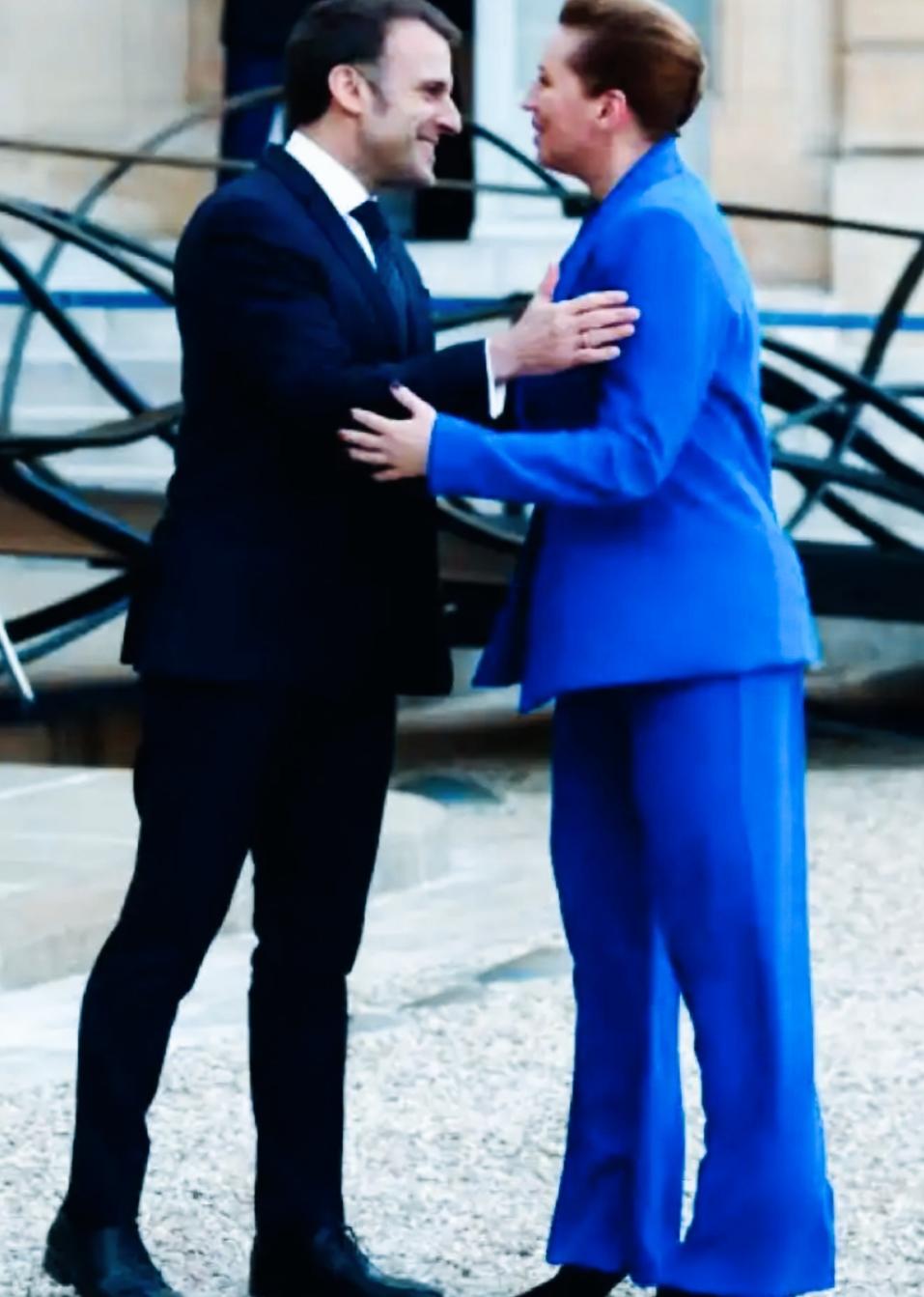 马克龙和丹麦女首相见面很热情啊! 两人脸上都洋溢着满脸的笑容! 两人手的姿势还挺一致,很有默契啊! 只是各自手放的位置不太一样啊!