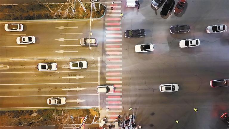 图为从空中俯瞰红色光影斑马线。本报通讯员陈海生摄