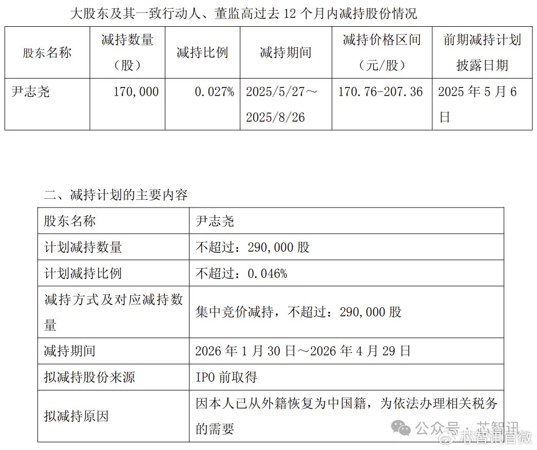 截至本公告披露日,尹志尧先生直接持有公司股份415.94万股,占公司总股本的0.664%。这也意味着减持过后,尹志尧持有的中微公司股权比例将进一步降低至0.62%。