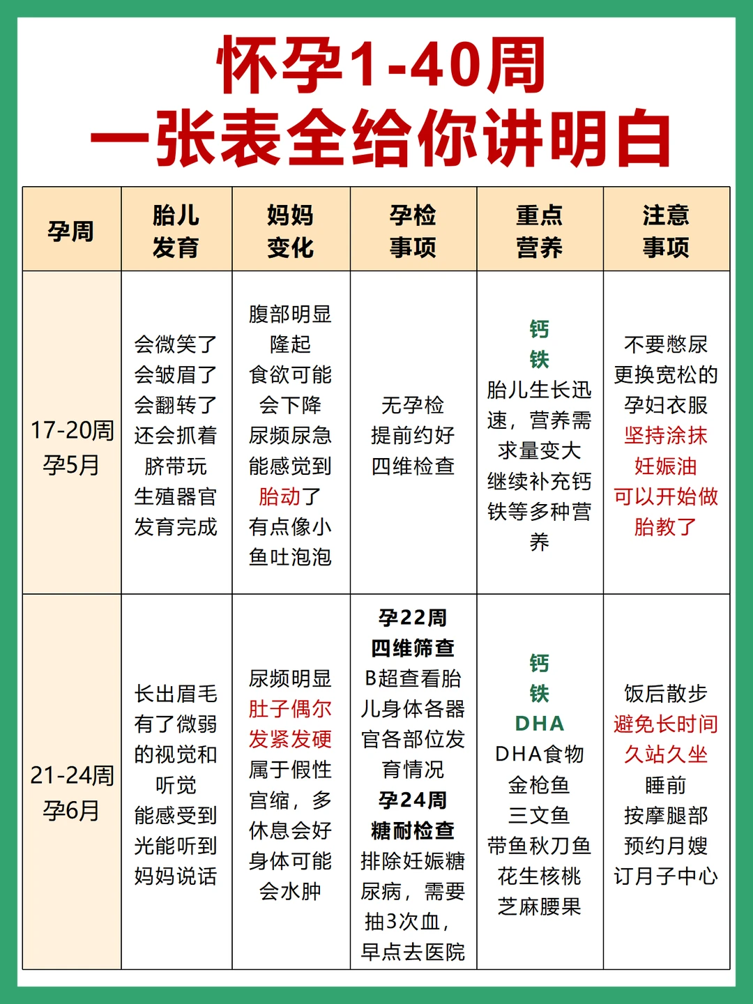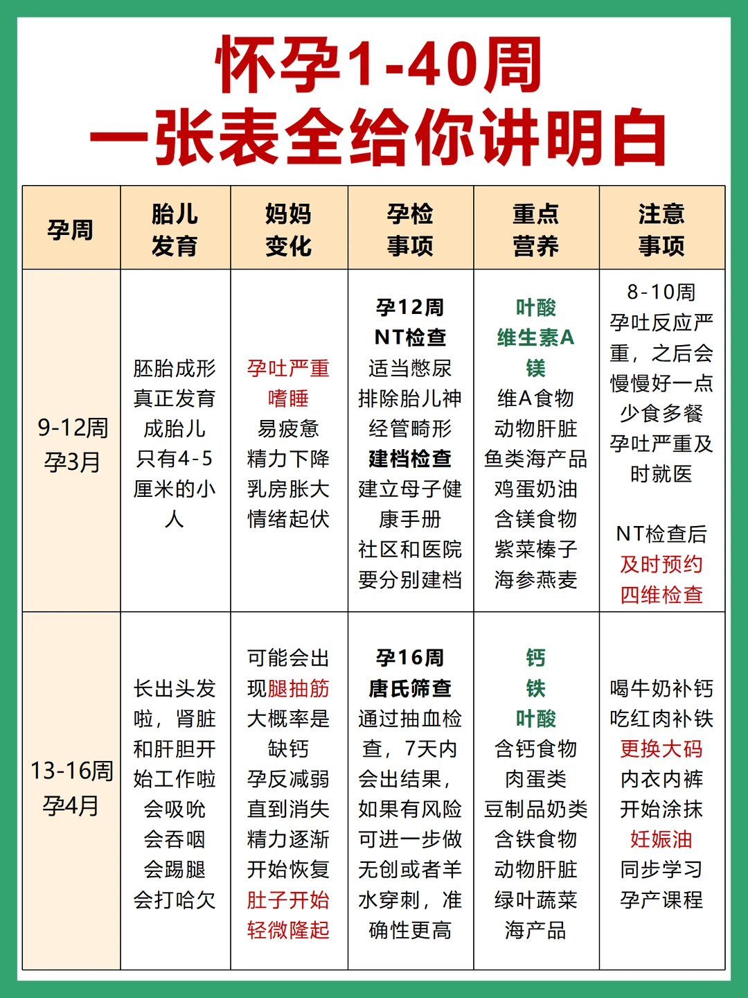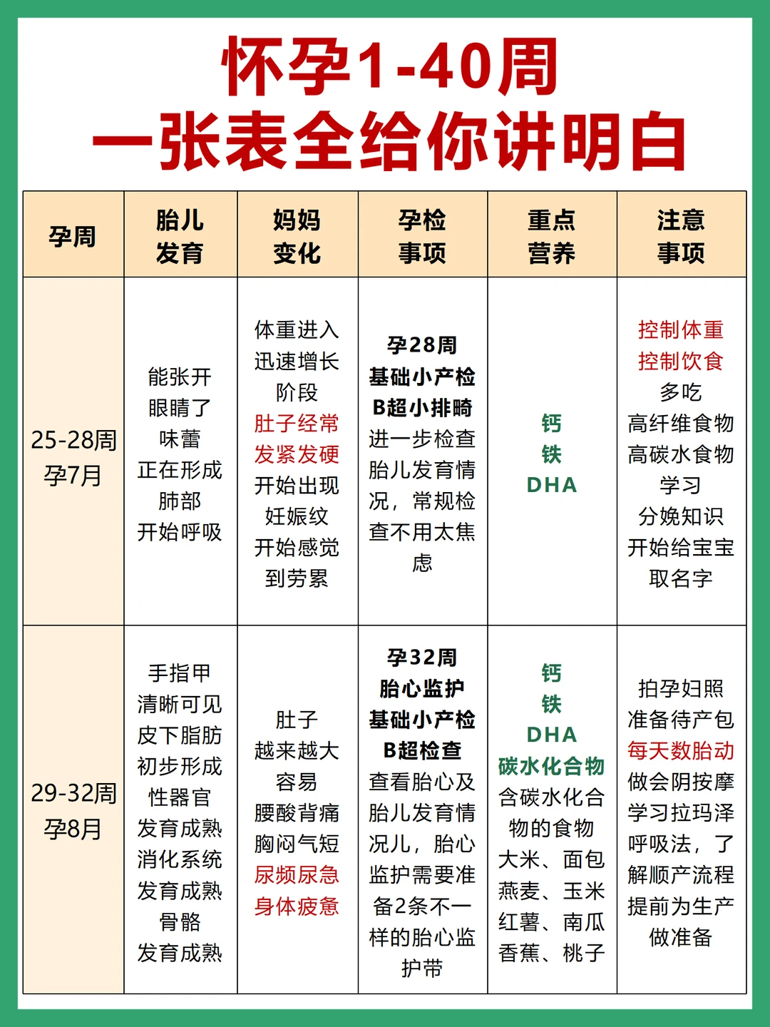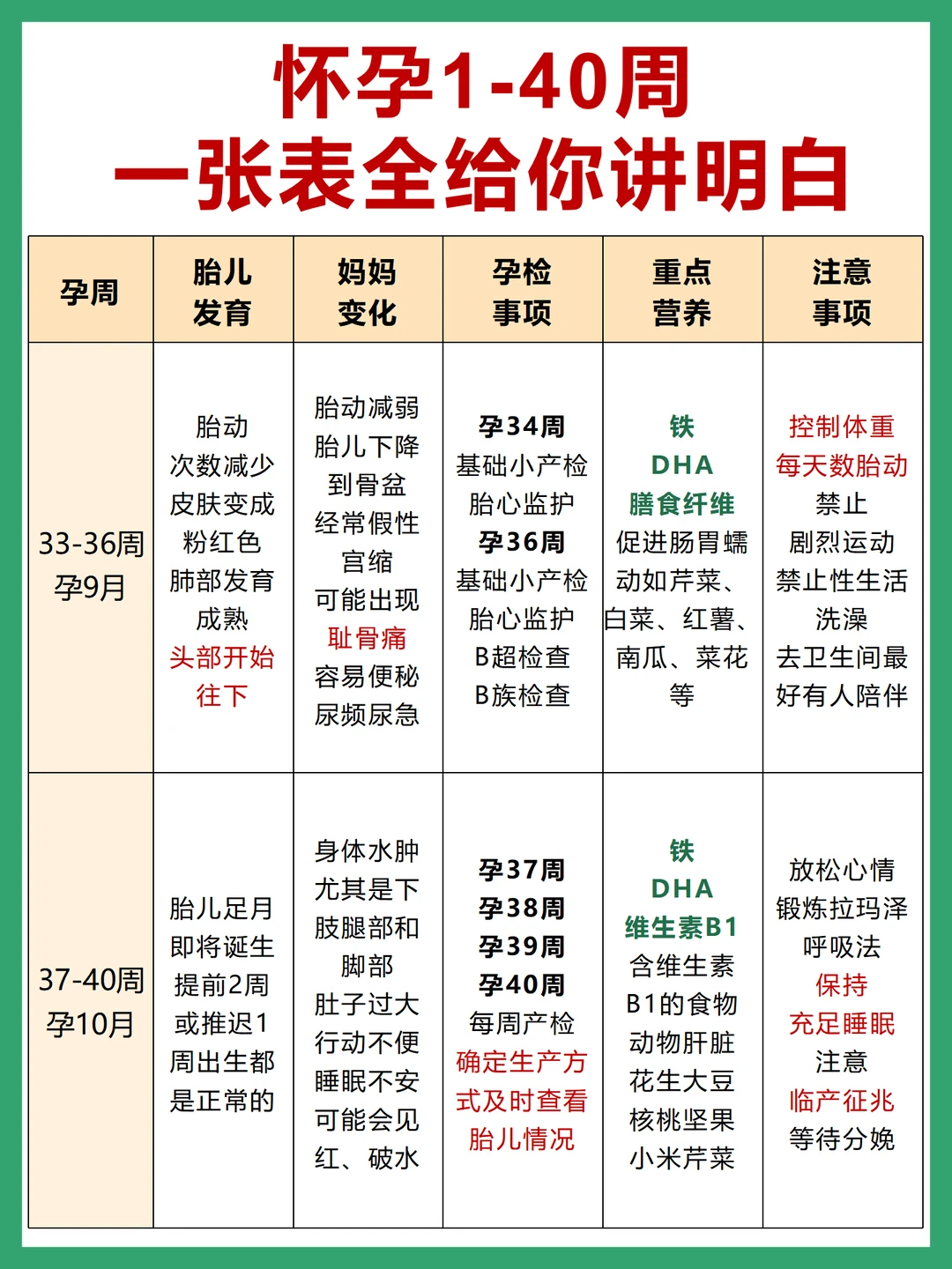 ❤️怀孕1-40周 1⃣️每周胎儿发育情况 2⃣️孕妈妈身体变化 3⃣️孕检事项 4⃣️重点营养补充 5⃣️注意事项 这篇一次性给你讲清楚