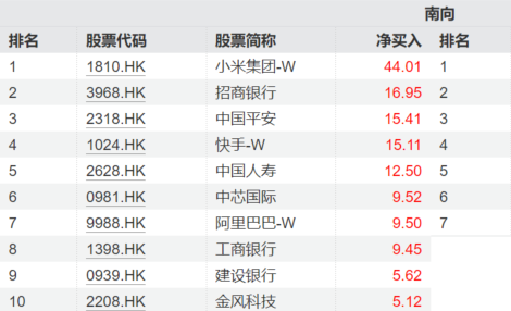 南向资金持续流入港股。近七日以来,小米集团-W以44.01亿港元的净买入位居榜首,快手-W、中芯国际、阿里巴巴-W也均位于净买入榜前十。