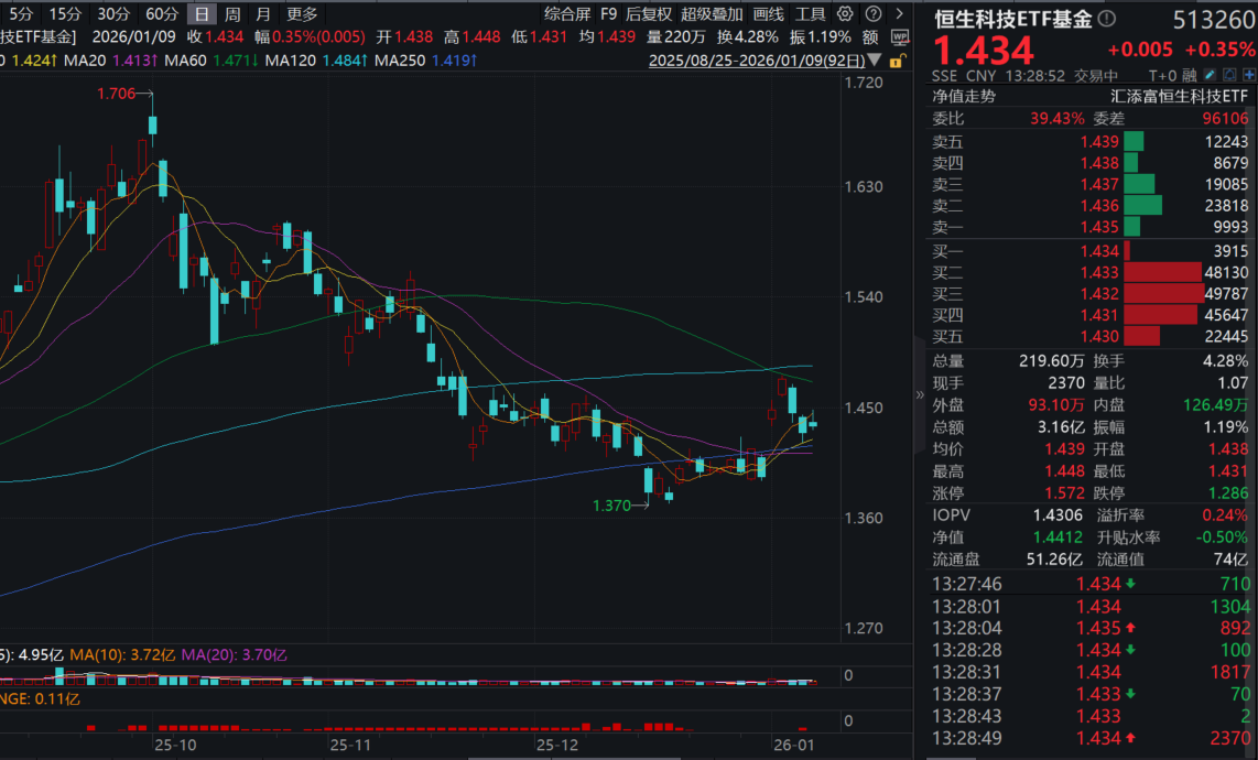 同类唯一15BP最低档管理费的恒生科技ETF基金(513260)亦涨0.35%,盘中成交额已超3亿元。资金面上,近20日有10日获资金青睐,昨日再获净流入超1500万元,基金最新融资余额强势反弹,攀升至超1.4亿元,基金最新规模达73.88亿元!