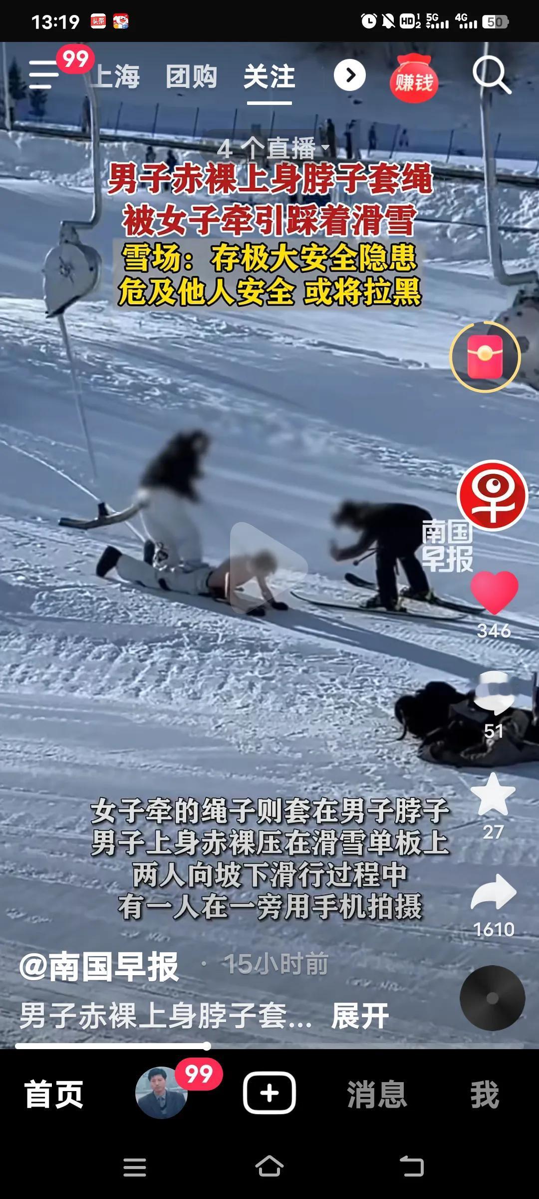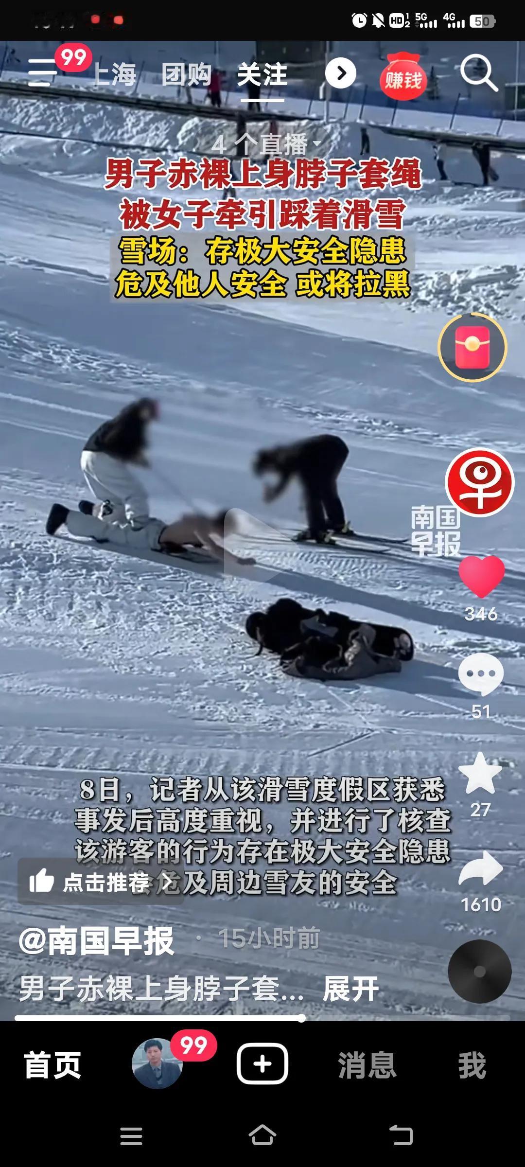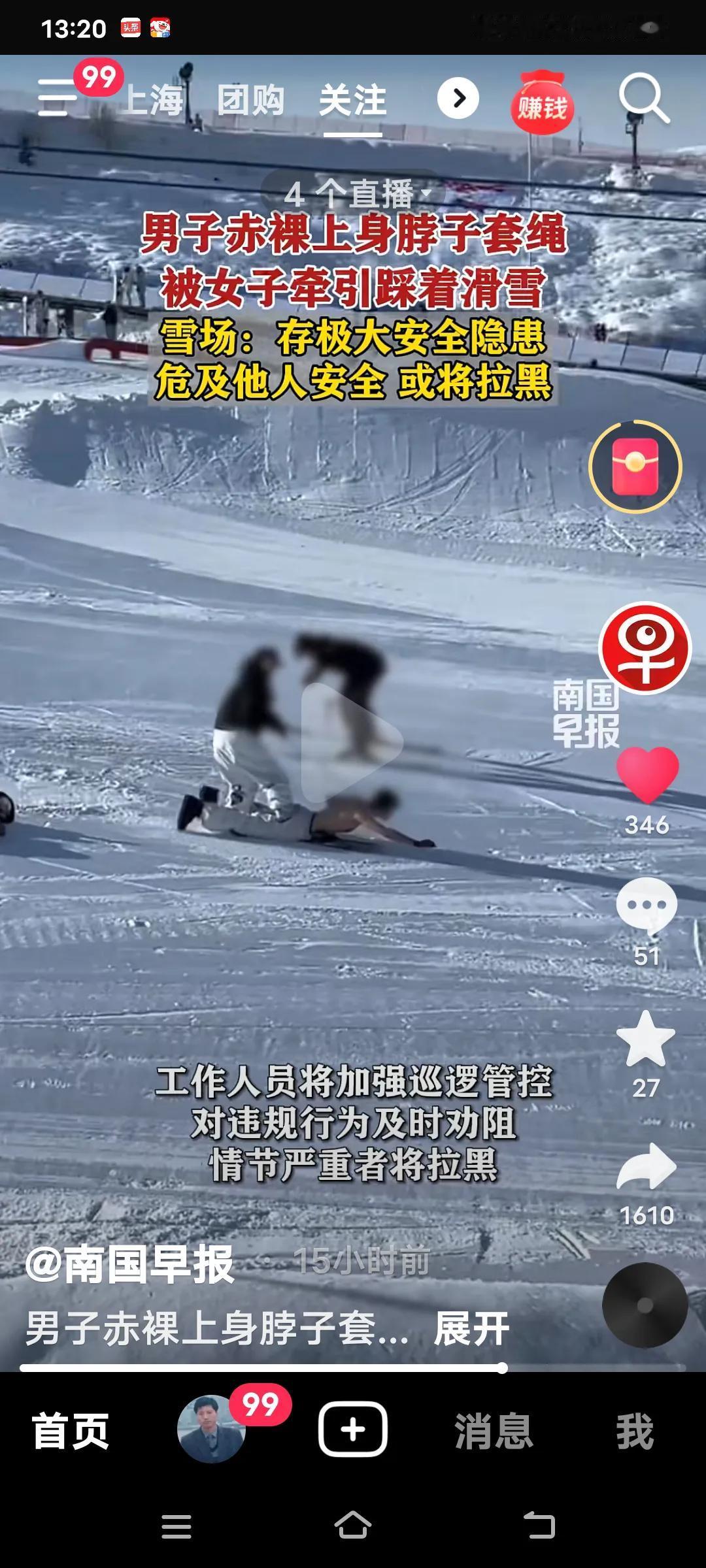 这到底啥意思啊?新疆阿勒泰将军山滑雪场这事儿可太惊人了!1月5日,一个半裸男子趴在滑雪板上,一名女子用绳子套着他脖子,还踩在他身上滑雪,旁边还有人专门拍视频。那画面,真让人无语! 雪场工作人员起初可能觉得是雪友私教,有个人小癖好才拍视频。可这行为存在极大安全隐患,在公共雪道还不戴护具,万一撞到别人可怎么办?后来雪场重视起来,要加强巡逻管控,情节严重的还会拉黑。 网友大多都在谴责这种行为。滑雪本是一项快乐的运动,可别整这些博眼球又危险的事儿了。 安全永远是第一位的!万一把生活搞得一团糟,那可真是后悔一辈子!阿勒泰单板滑雪 新疆将军山滑雪