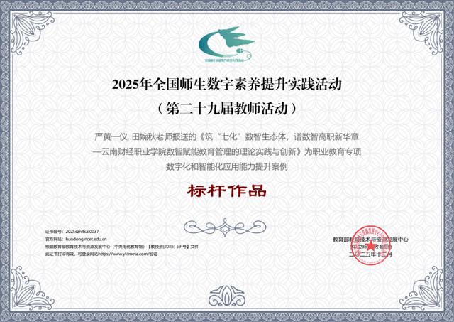 近日,教育部教育技术与资源发展中心(中央电化教育馆)2025年全国师生数字素养提升实践活动结果正式公布。云南财经职业学院报送的《筑“七化”数智生态体,谱数智高职新华章——云南财经职业学院数智赋能教育管理的理论实践与创新》案例继成功入选该活动后,再传捷报:在全国30个省(区、市)报送的职业教育专项2699件作品中脱颖而出,成功获评“职业教育数字化与智能化应用提升案例”专项“标杆作品”。